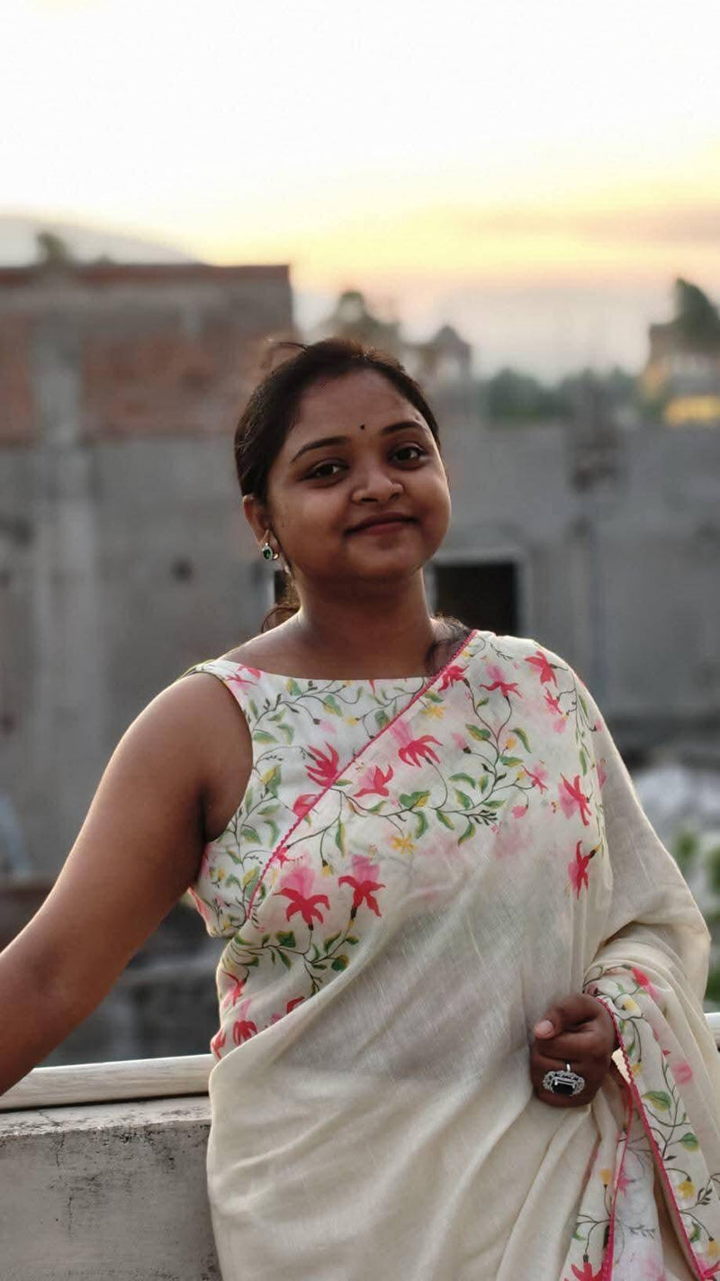 This blouse is the perfect blend of simplicity and elegance. The soft cream fabric paired with delicate pink and green floral embroidery creates a refreshing and graceful look. It’s light, comfortable and gives off such a soothing vibe — ideal for both daytime outings and festive occasions. The sleeveless design adds a modern touch, while the floral patterns keep it beautifully traditional. A timeless piece that enhances the natural charm of any saree look!Tapaswini BarikPhool - Simply fabulous Blouse styleExcellent look and fit. I got many compliments on this blouse design ...