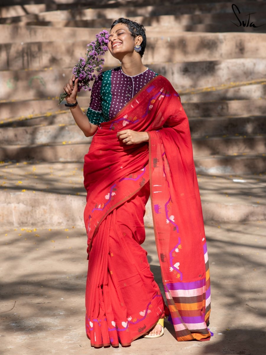 Live life to its fullest when you wear this elegant red handloom Jamdani saree.