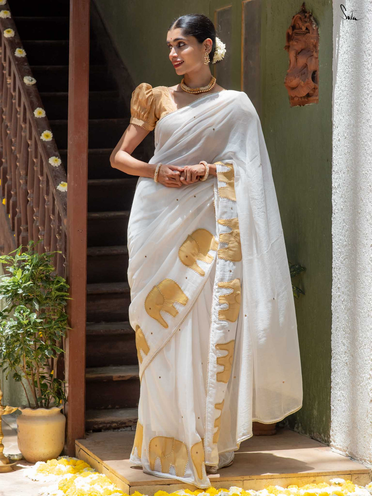 Aanavattom is inspired by ‘Aana’, the Malayalam word for elephant. Crafted in soft white cotton mul, it features intricate gold elephant patchwork on the pallu. The body is finished with delicate gold samosa lace, pearl, and fine sequin detailing adding a festive shimmer to your look. Lightweight, breathable, and comfortable all day long, Aanavattom is perfect for parties and festivities.