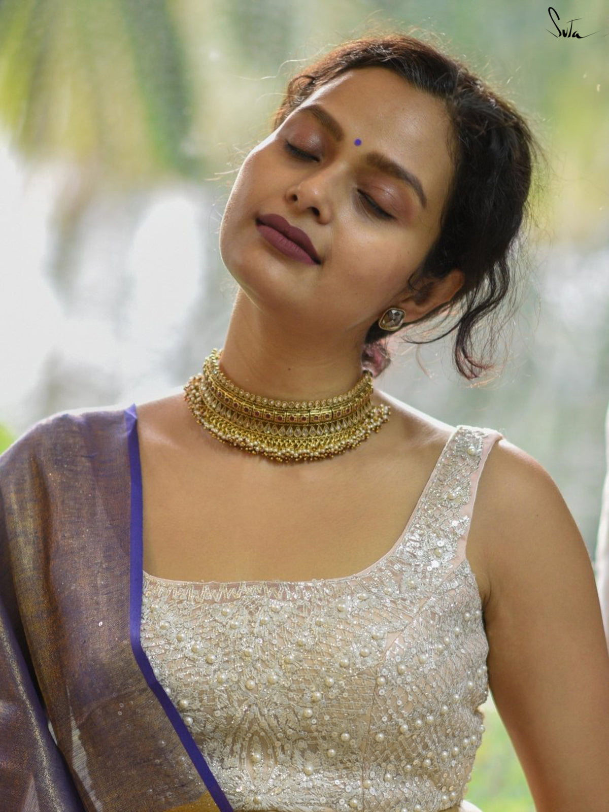 She is light, and airy. She flutters through your dreams as if by chance, and reminds you that life could be dainty, innocent and pure. Dont you get taken in by just this - shes fearless and sophisticated, and yet exudes purity and virtue. Shes got the look! And wherever she goes, she leaves a little sparkle behind. Youve got to look at the blouse close up “ the baby-pink colour of it is almost a suggestion, its so subtle, so soft.