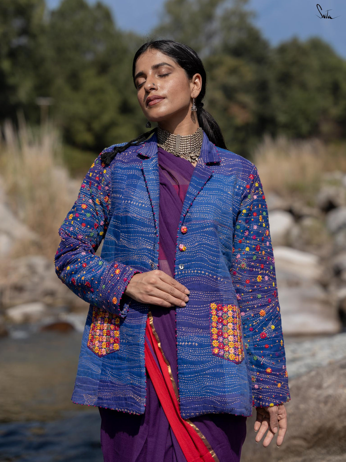 Inspired by the tranquil coastal town of Bardez, this jacket from Suta’s Bageecha collection tells a story of serene blues and vibrant florals. The deep shades of blue, quilted with traditional Katha running stitches, carry the stories of skilled hands passing from one artisan to another. The multicolor floral embroidery on the pockets and sleeves, meticulously hand-stitched, showcases the artistry of our craftsmen who infuse each design with their heart and soul. The pink French knots at the jacket and sleeve hems are a delicate finishing touch, each knot a tiny act of love. The buttons, embroidered with flower motifs, further reflect the care that has gone into this jacket. This creation is more than just a garment it’s a narrative of tradition, artistry, and the love of our craftsmen that flows through each intricate detail.