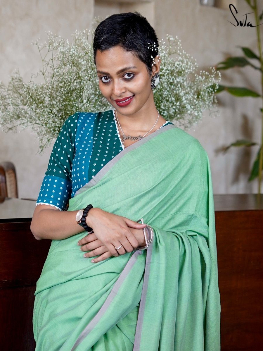 Non Padded Green Cotton Blouse with V Neck and Front Hook Opening