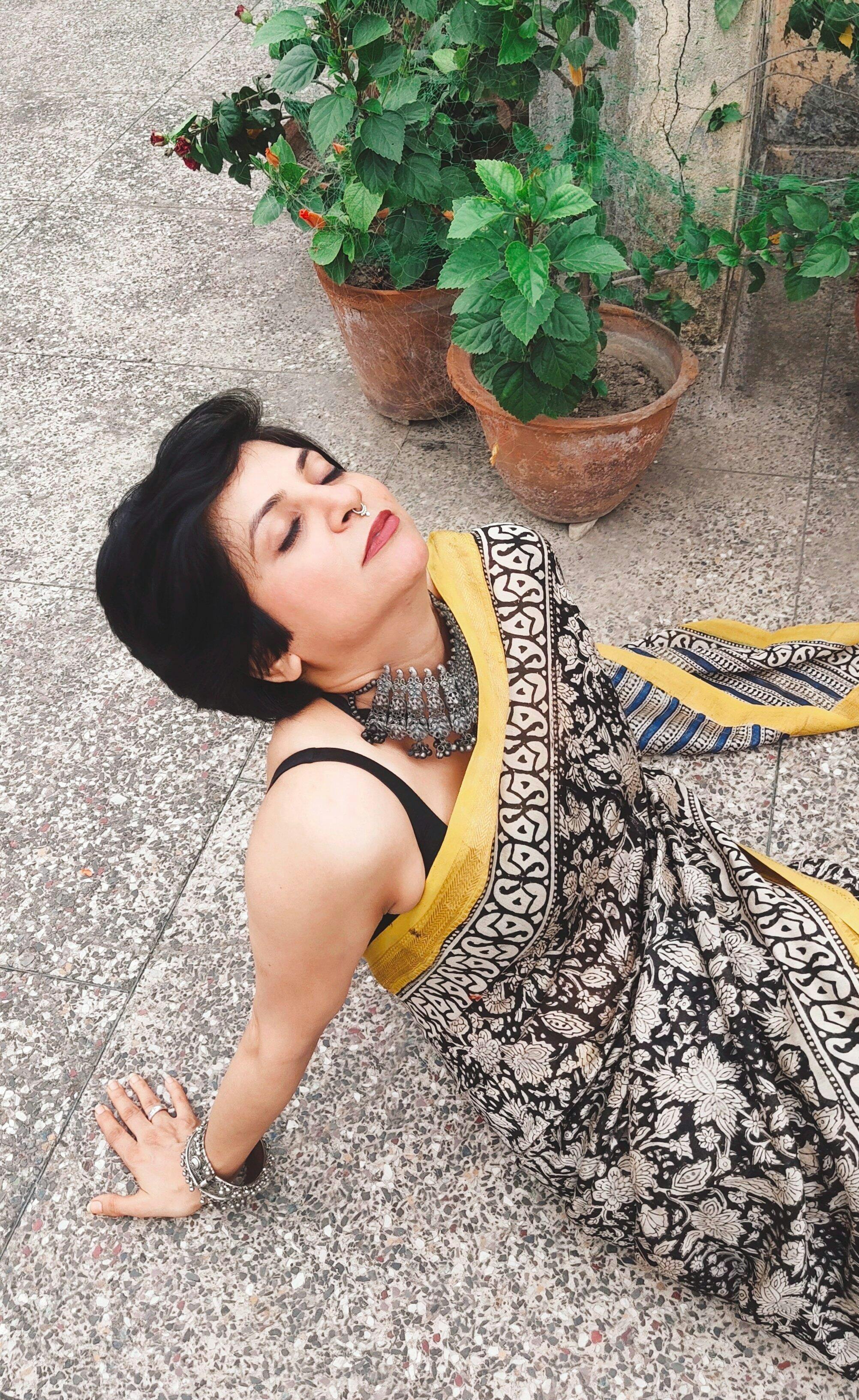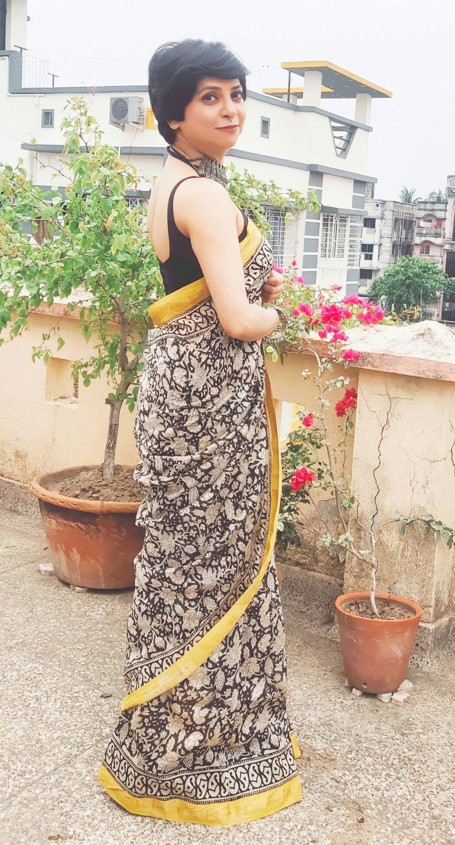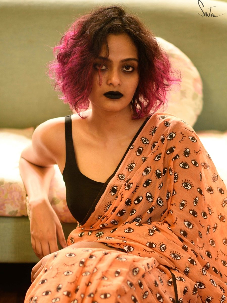 Su, the model is wearing a size S blouse and the saree link is : Kali Nazar, Crush Polkaness