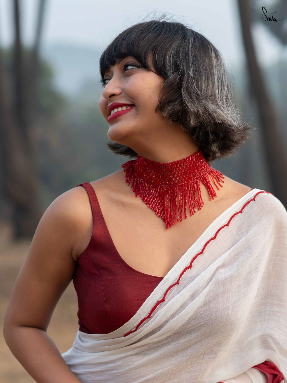The model is wearing size S blouse and sarees are Aman Naina, Which Phool