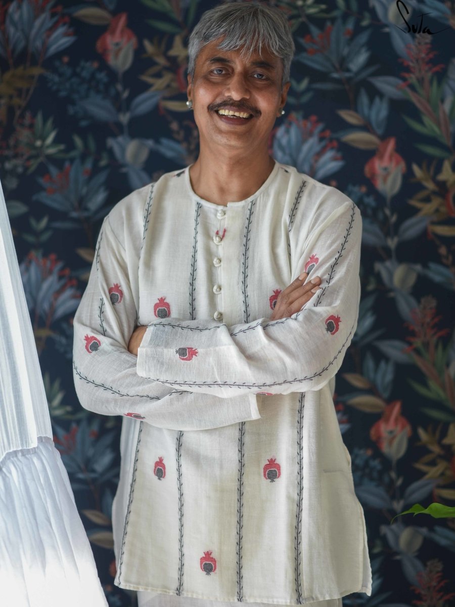 This is a handloom cotton kurta. The beautiful pomegranate-inspired motif that symbolizes the co-existence of contrasts is handwoven into the fabric and brings a gorgeous charm to the kurta. It reflects the idea of breaking stereotypes and looking at things in more than one way, of acceptance and un-labeling.Handloom cotton is a type of fabric that is woven using hand operated looms. Two sets of interlacing yarns, the warp (length) and weft (width), are woven on a mechanised loom operated by weavers. These looms do not use electricity. Human handling lends the fabrics a unique feel and renders the fabrics more value. The art of hand weaving is labour intensive and takes a longer time. But, the beauty it adds to the fabric is priceless. Choosing handloom cotton supports the rich weaving heritage of India and lets the weavers carry on the precious art-form to the future generations as well.