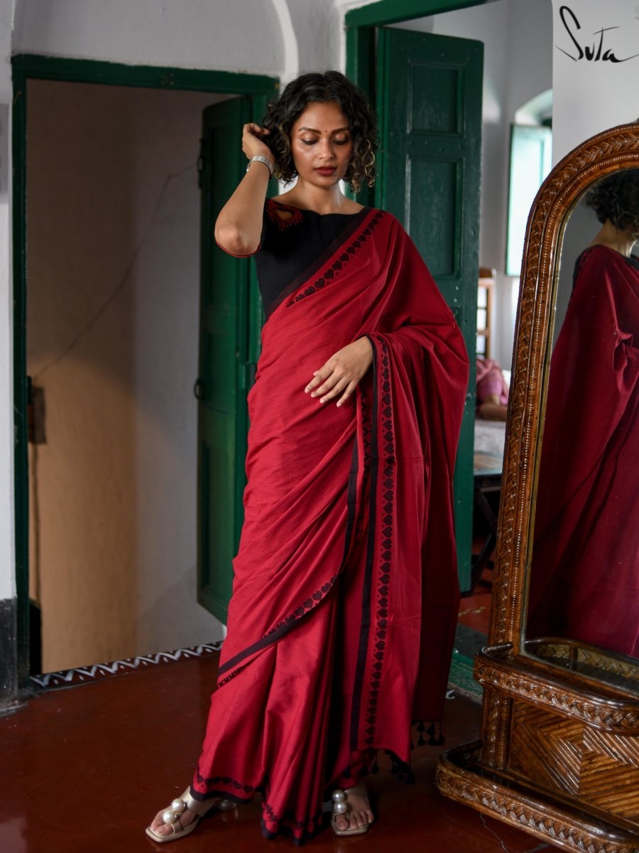 The Behekta Dil saree is a beautiful handwoven red cotton saree that is embellished with black heart-shaped butis. This saree is a part of our latest saree collections. The red saree design will accentuate and highlight your curves. Being a cotton saree design, the Behekta Dil saree is comfortable to wear in all seasons. It can be paired with a variety of blouses.