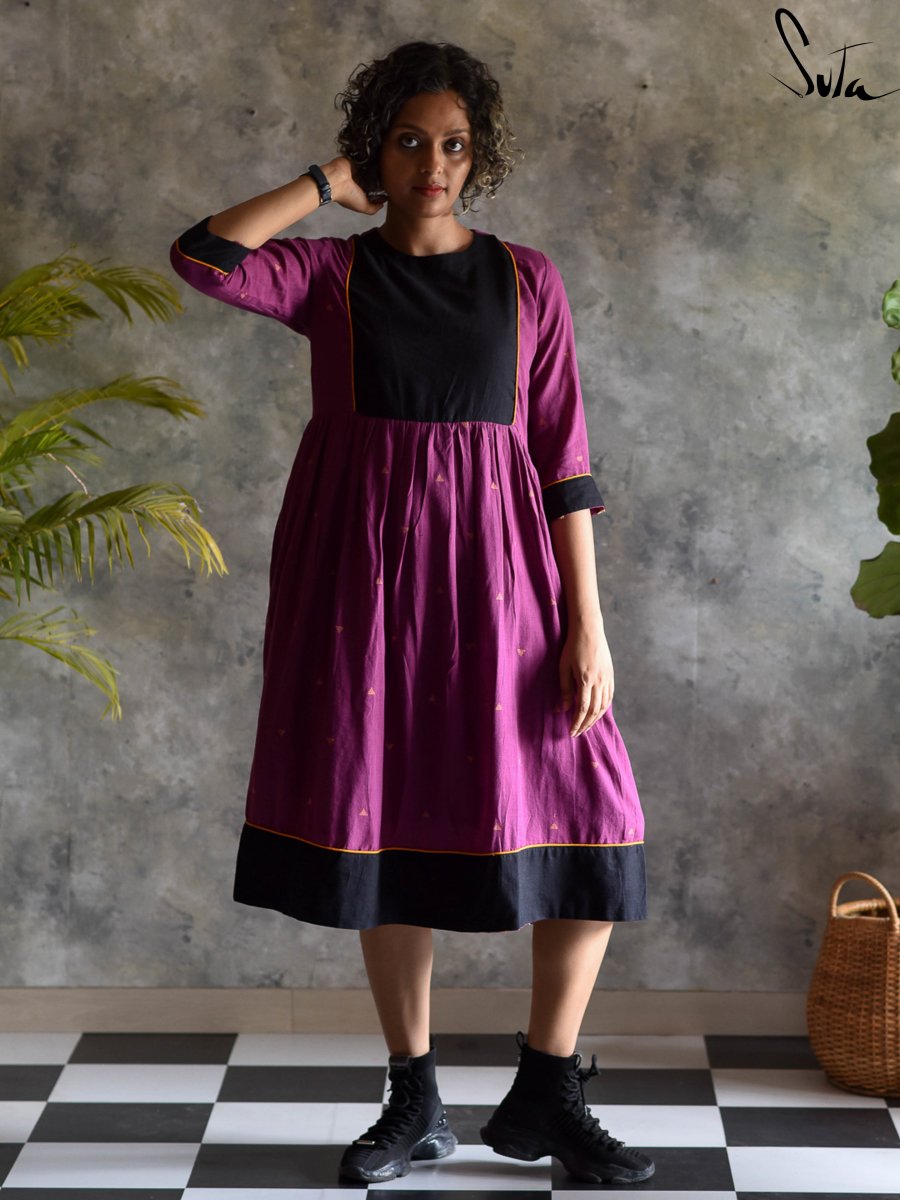 Purple Cotton One Piece Loose Fit Dress with Round Neckline