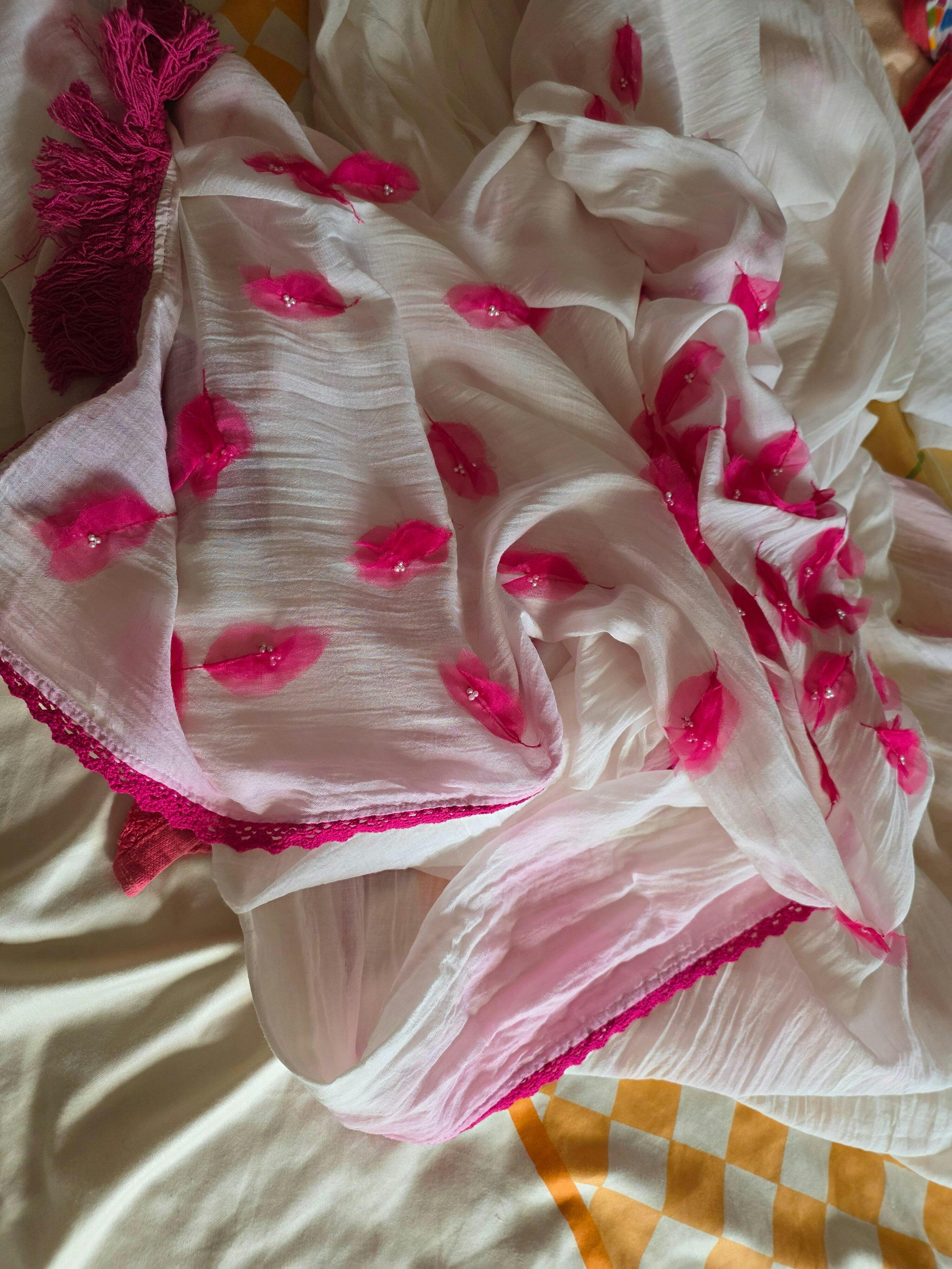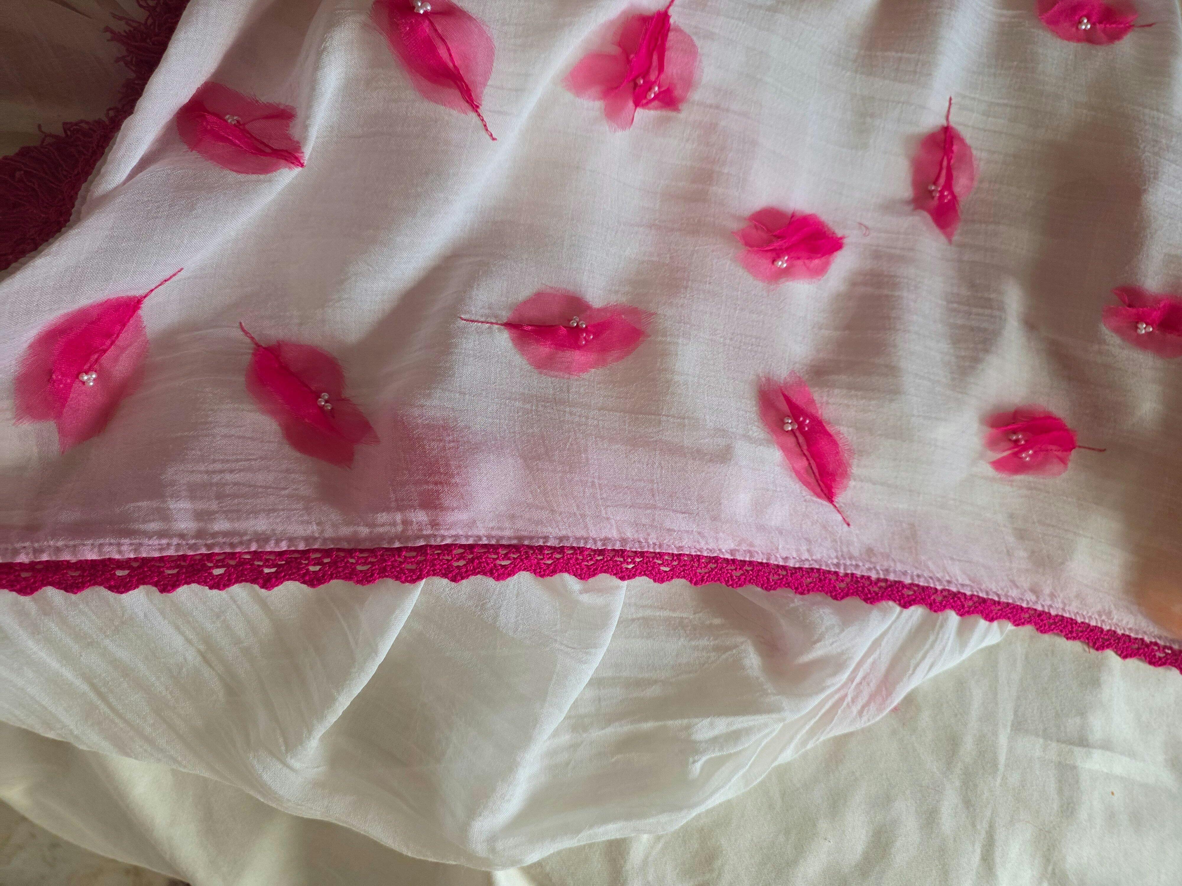 This white mul cotton saree feels like a quiet autumn afternoon soft, dreamy, and full of grace. Scattered across its canvas are delicate, hand-stitched bougainvillea flowers in pink organza, each one blooming like a secret, captured mid-fall. The 3D florals add a romantic, whimsical texture, while lace finishing and tassels bring a gentle flow with every step. It’s not just a saree it’s the rustle of petals, the hush of breeze, and the feeling of autumn… no matter the season. Wear it when you want to feel a little closer to nature. Or yourself.