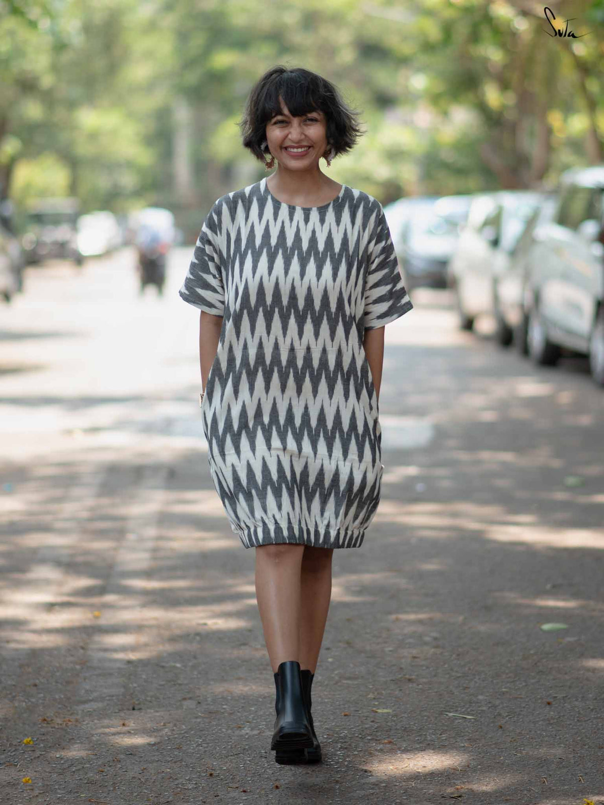 Grey White Cotton One Piece Fancy Ikat Design Dress with U Neckline