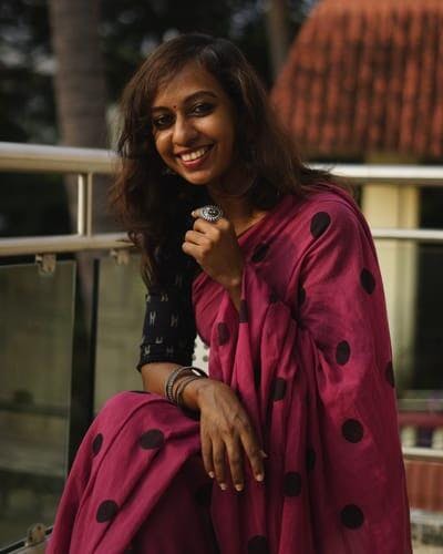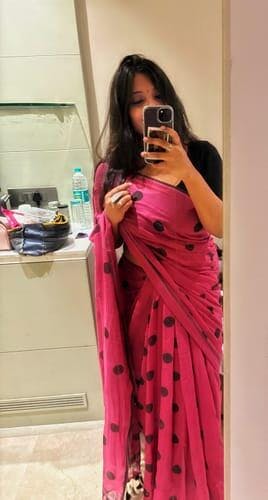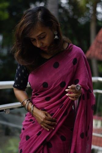 This gorgeous pink saree in made-in-heaven mul with screenprinted polka dots is simplicity stealing the show!