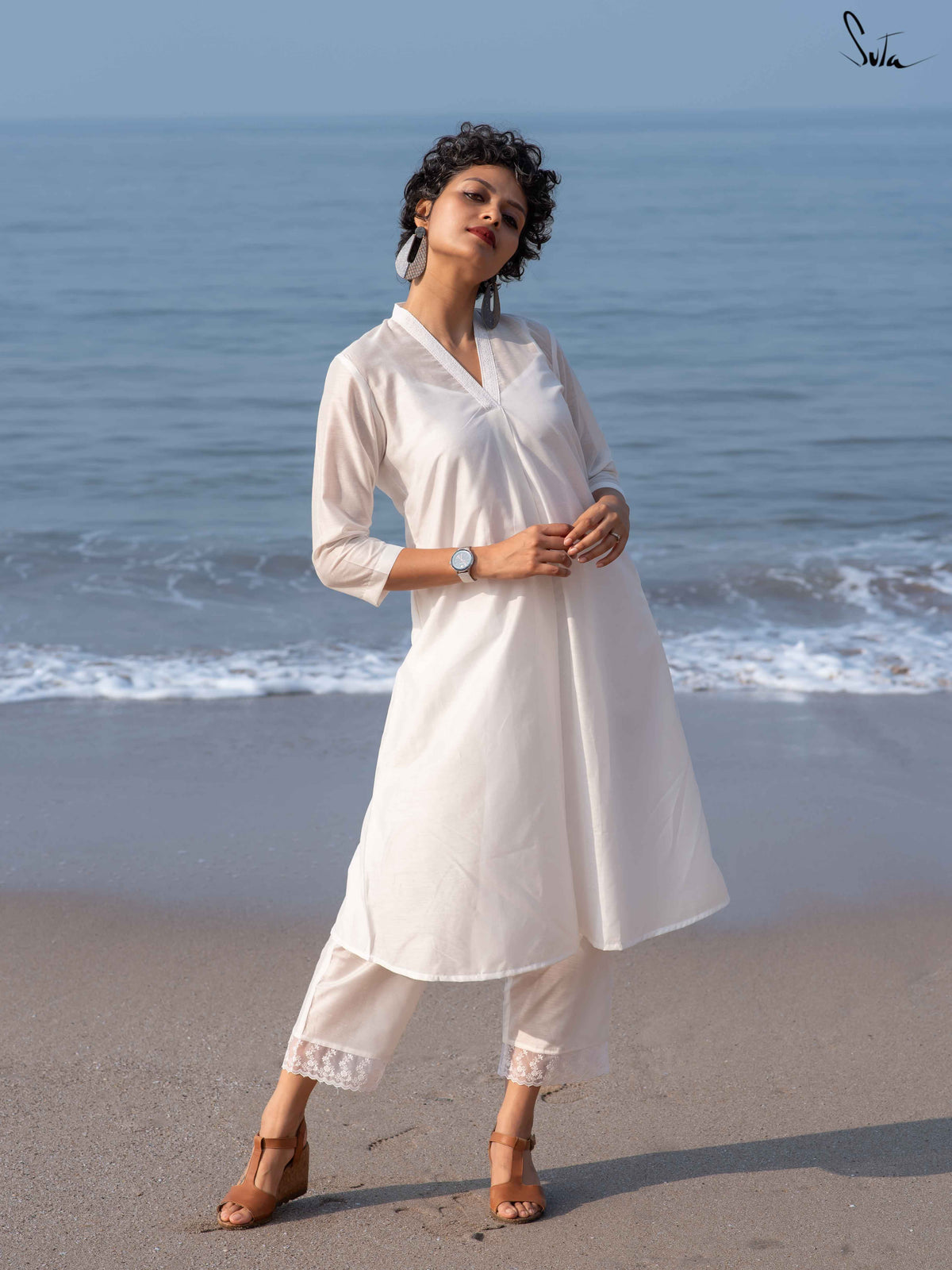 This gorgeous white kurta set is made of a viscose-based Chanderi fabric and embellished with lace. Chanderi is a luxurious but lightweight fabric. This weave was favoured by royalty and continues to be a favourite for both regular wear and festive occasions. Viscose is produced from regenerated cellulose. It is a versatile fabric known for its softness, comfort and breathability, as well as the ease with which it can be draped. It can be dyed easily and is often used as a substitute for natural silk or cotton.