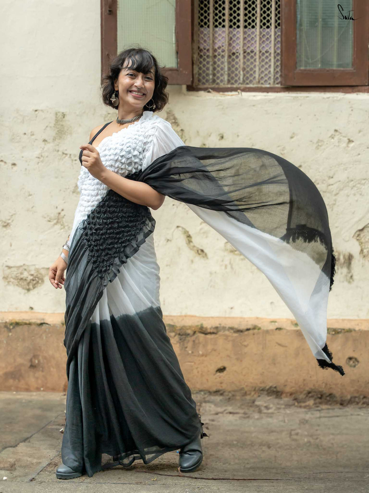 Classic yet full of contrast, this black and white ombre Mul Modal saree is elegance reimagined. The tie-dye shifts from inky depth to soft ivory, echoing shadows melting into light. Shadow-toned smocking adds dimension, while monochrome tassels lend it a crisp finish. It’s a saree that speaks in silences and stands out in a crowd with quiet power in every thread.