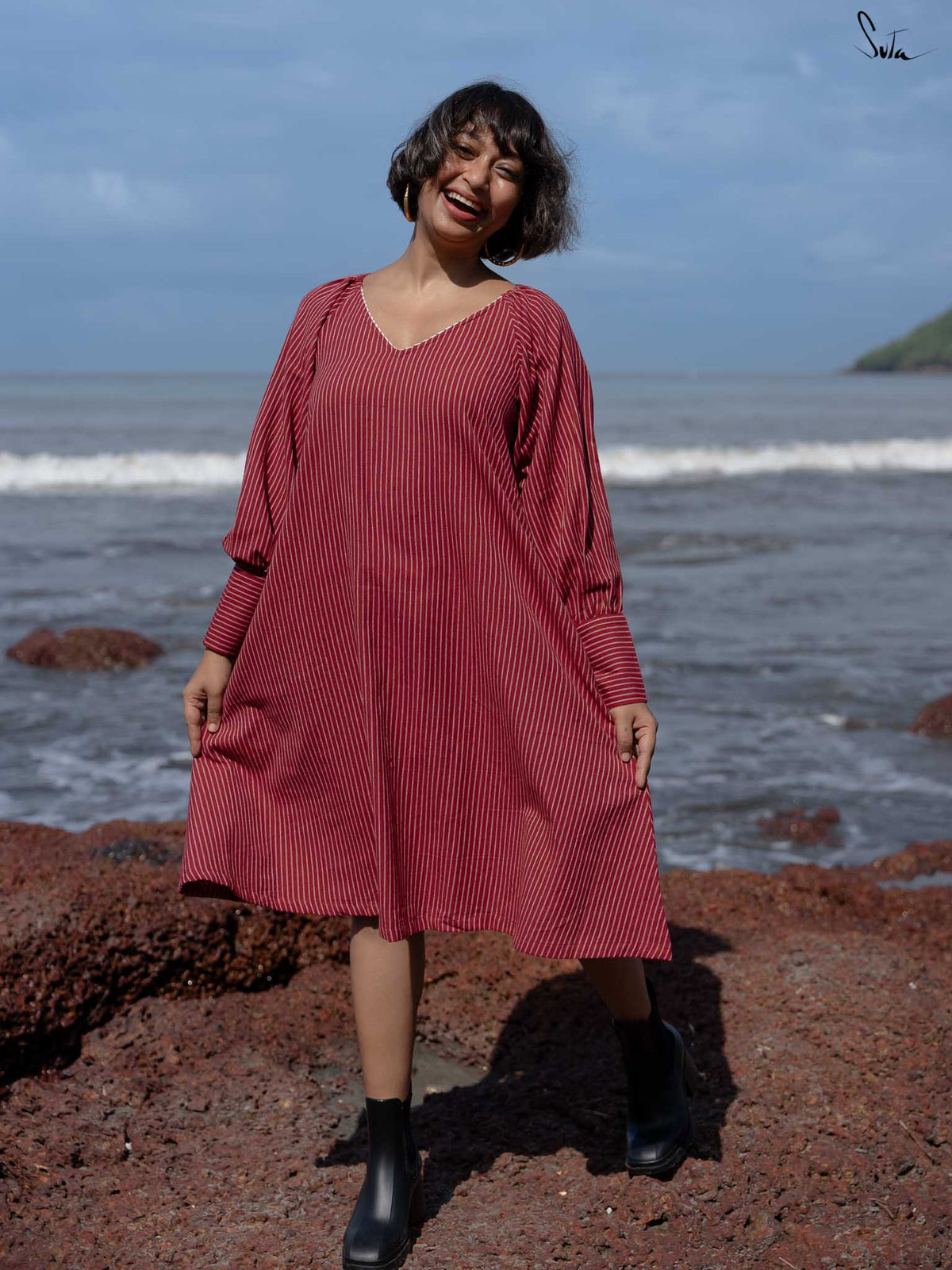 Red Cotton Flowy One Piece Dress with V Neckline and Pockets