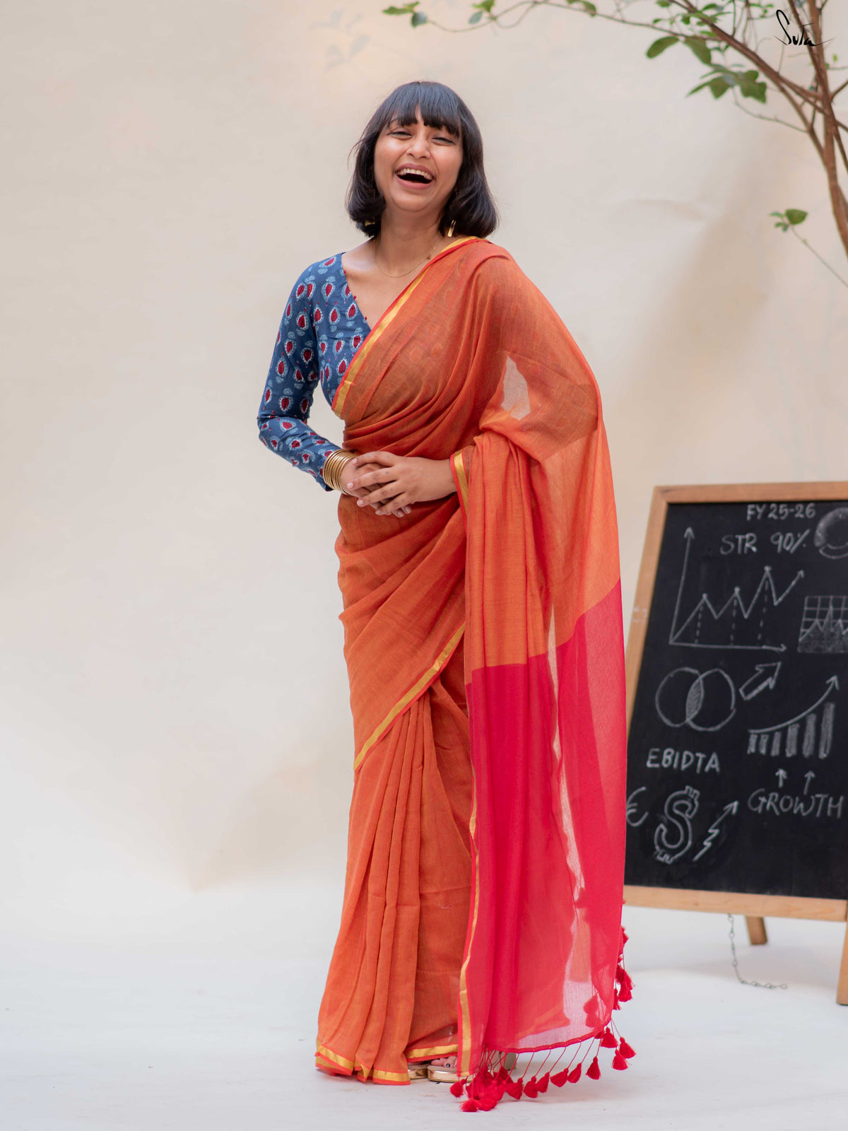 Bold, bright, and full of fire - Chilli Phool turns up the heat, minus the heaviness. Crafted in soft mul cotton, this orange saree feels airy and effortless, while the contrast red pallu adds a striking pop that instantly stands out. A thin gold zari border runs along the edges, keeping the look sharp and balanced.