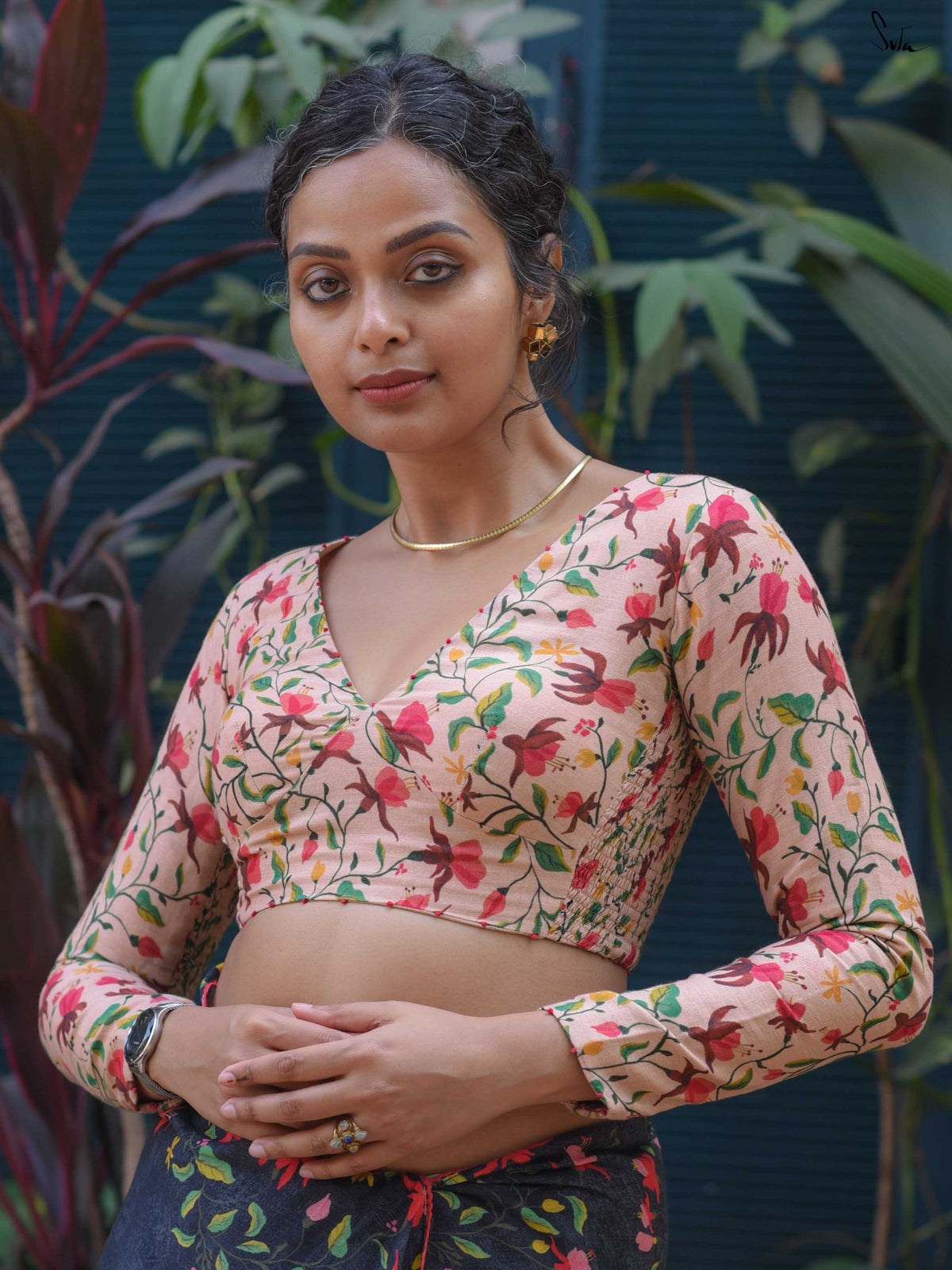 A warm brown blouse designed for comfortable everyday wear. Made from a soft cotton-linen fabric, this blouse feels breathable, lightweight, and easy to carry through long hours.It features a brown base with digital floral prints and a flattering V neckline. Delicate French knot detailing on the neckline adds a subtle handcrafted touch, while the full sleeves give it a more structured, work-appropriate feel.Finished with a back hook opening and smocking on the sides, this blouse offers a flexible and comfortable fit that pairs effortlessly with both printed and solid sarees.