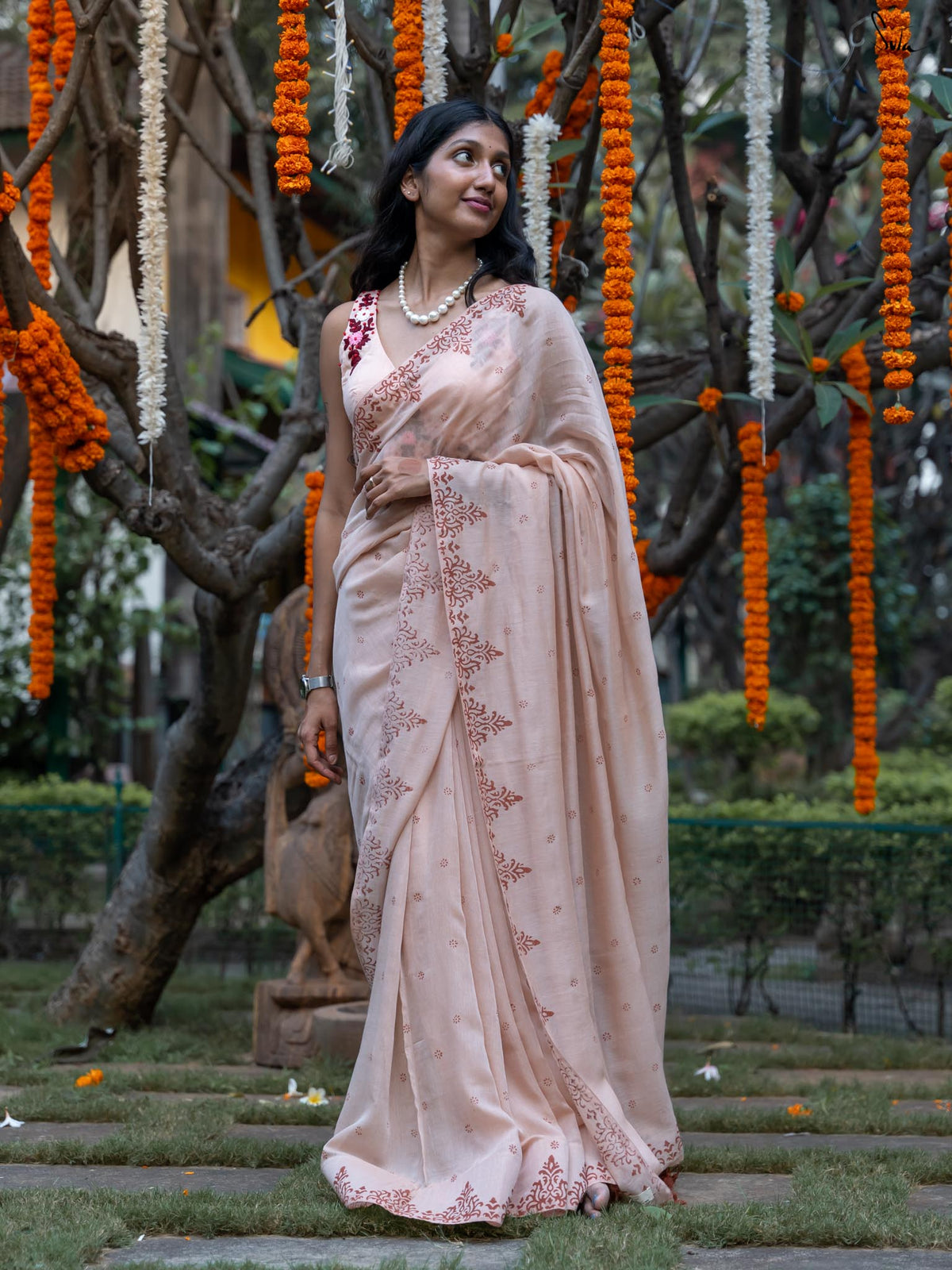 Embrace the essence of universal beauty with Cosmic Dream, a cream saree woven from the softest mul cotton. Adorned with delicate printed floral motifs all over, the detailed red floral border adds an ethereal charm to your look. Drape the magic of Cosmic Dream and feel like a princess.