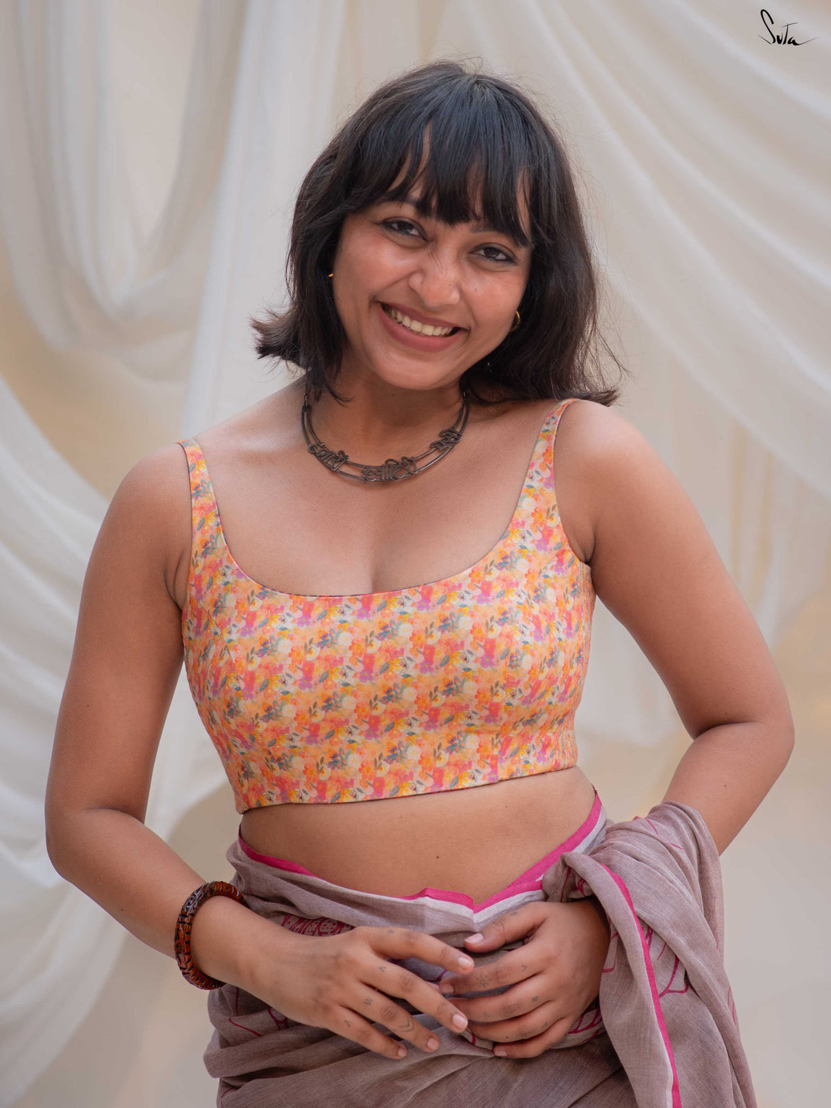The model is wearing size XS blouse and the saree called The Tanned Rouge