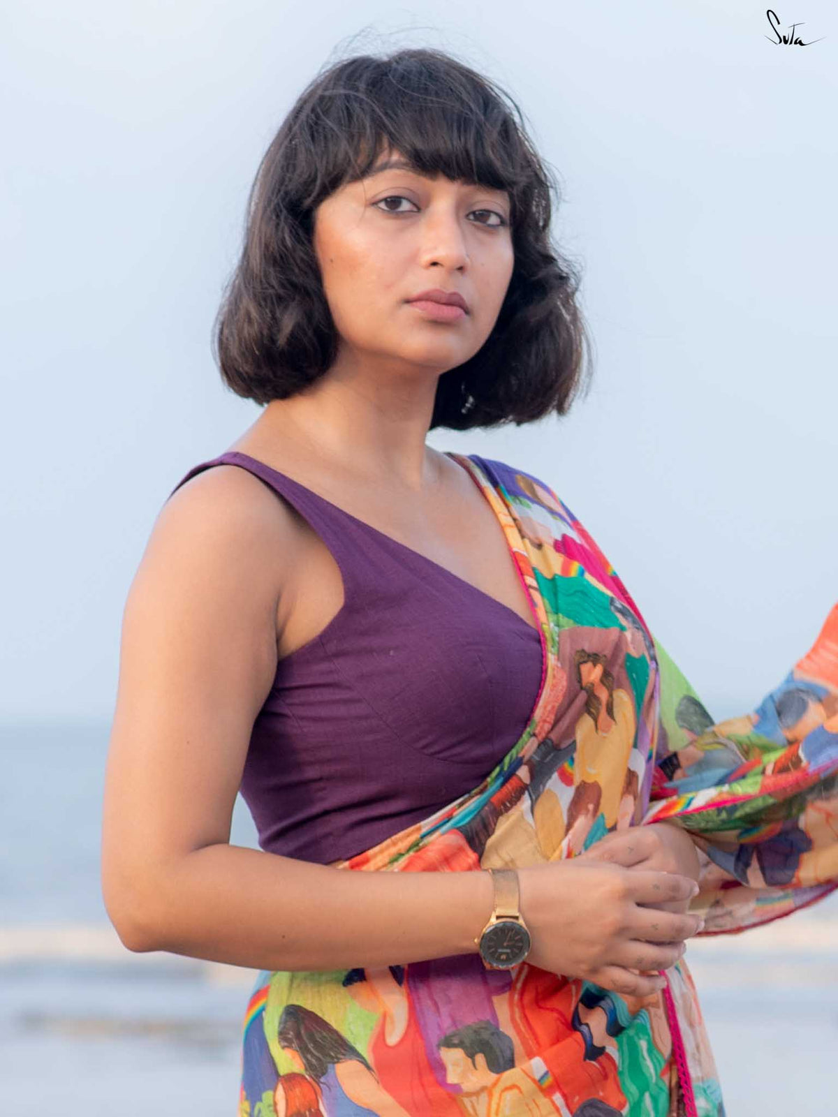 The model is wearing size S blouse and the sarees are Twisted, Eyes on you, Smoked Berry Roasts