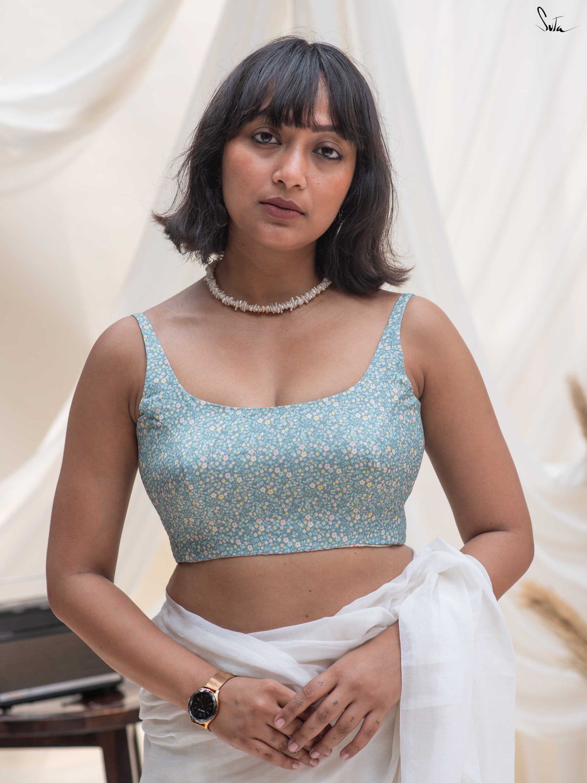 Reversible sleeveless padded U-neck blouse in light blue and off-white cotton with multicolour floral prints stretchable comfortable everyday blouse for sarees