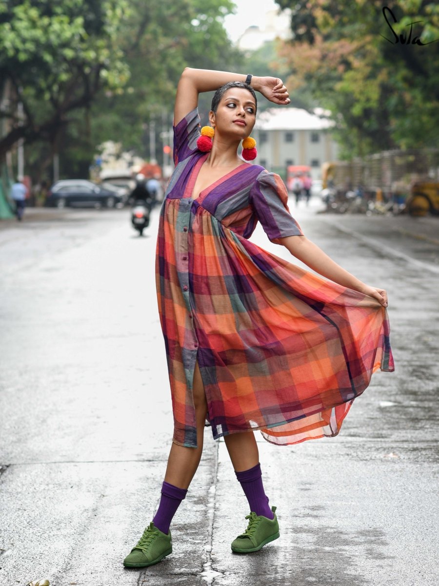 Multicolour Cotton One Piece Dress with V Neckline