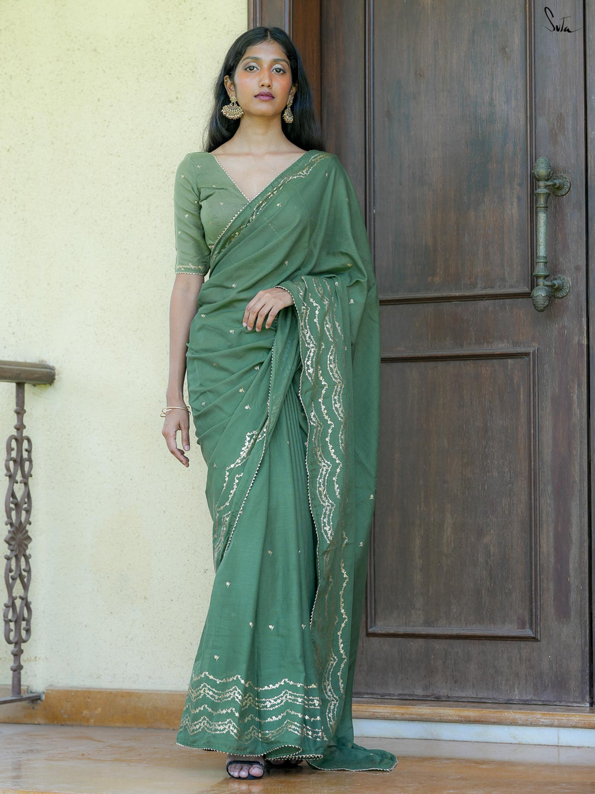 Green Cotton Viscose Saree with Gold Foil & Floral Scallop