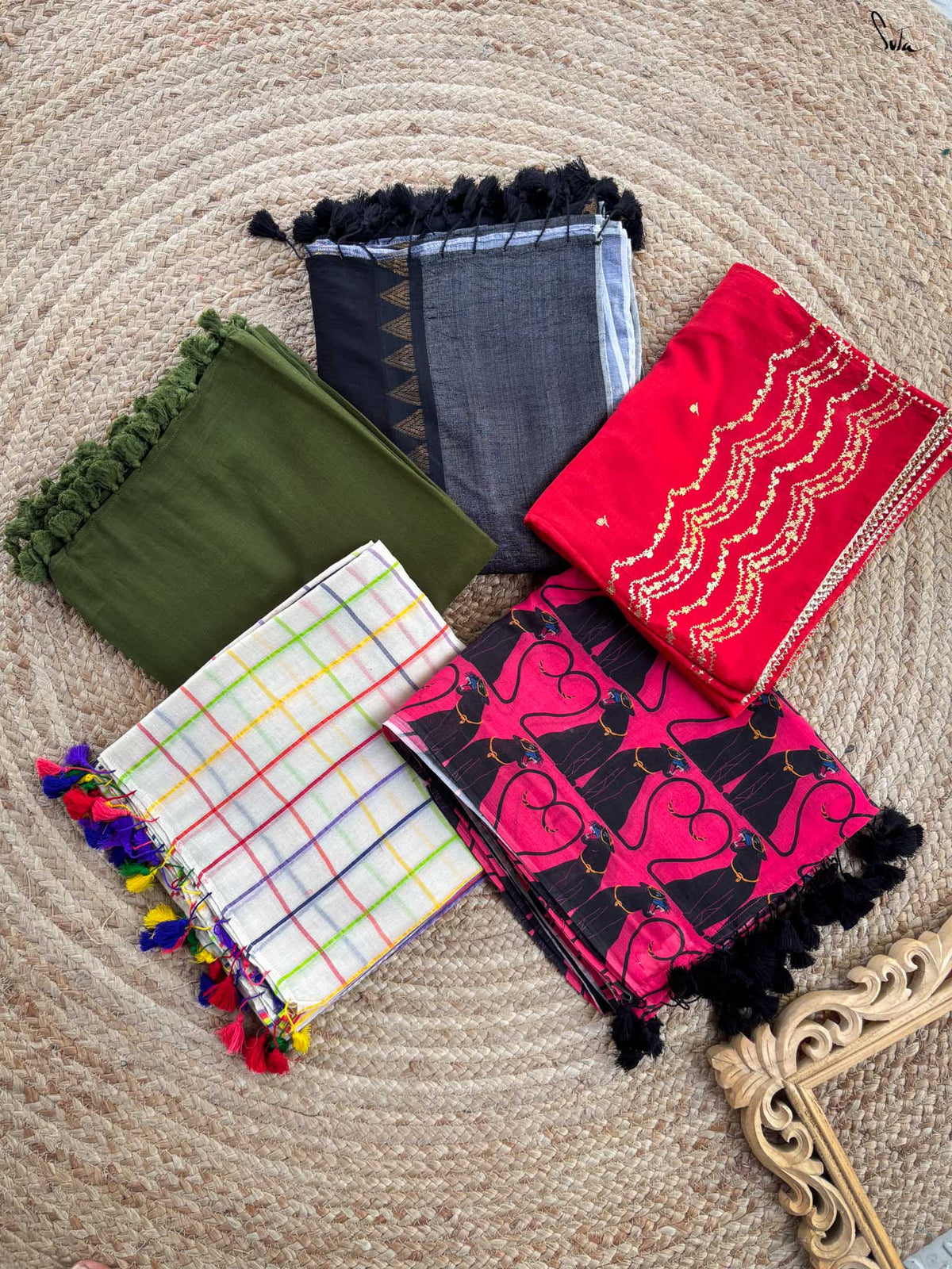Wrap yourself in luxury with our majestic "Golden Aura" saree combo! This regal collection of 5 sarees, crafted from a diverse range of fabrics, exudes a charming aura that's sure to elevate your style. Every drape will make you feel like royalty, as the intricate designs and majestic colors transport you to a world of elegance and sophistication.