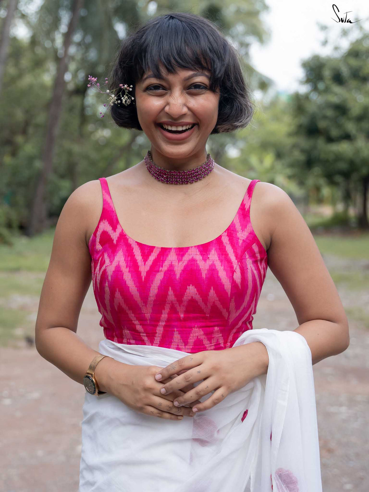 This is a pink and off-white handwoven Ikat silk blouse that makes you perfectly ready for the spotlight!