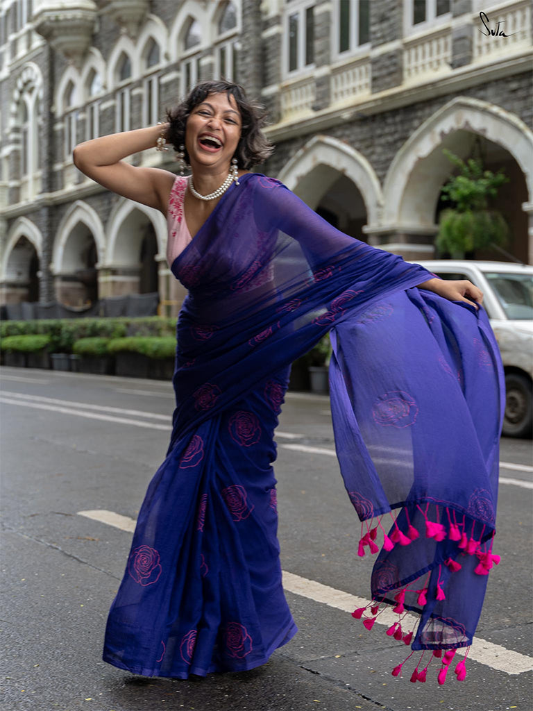 Suta's heavenly mul cotton will befriend your skin like a match made in stars. The buttery soft fabric is known for its delicate beauty, and this block-printed saree is a dreamy delicacy in itself. Part of the Taapsee × Suta collection, the vivacious purple hue celebrates your crazy imagination, whereas the sumptuous floral motifs over the saree whisper confidence and charm into your soul like a bunch of roses. Explore your magical thoughts by being you, draped in Gulabon ki Kahani!