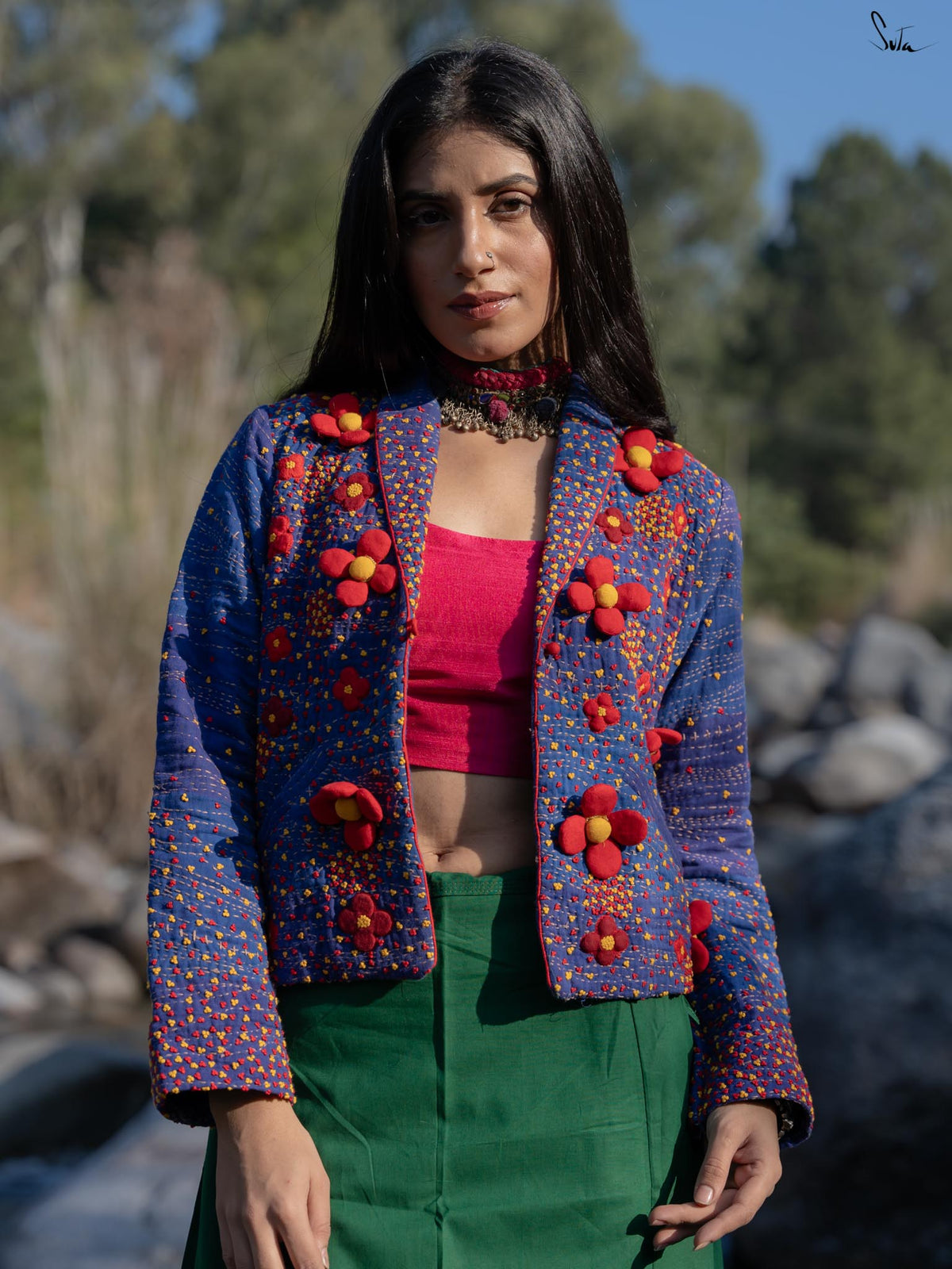 Gulbano, with its rich blend of blue and red, is a true labor of love from our artisans. The hand-quilted jacket, with Katha running stitches and the applique work of stuffed flowers, showcases the immense effort and care that goes into each piece. The French knots scattered across the fabric, the red flower embroidery, and the intricate detailing on the sleeves all reflect the dedication and passion of the craftsmen. These elements are not just decorative they are a result of years of tradition and craftsmanship being passed down from one artisan to the next. With every stitch, our artisans pour their love and stories into the fabric, creating a jacket that is not only beautiful but rich with meaning. This piece is a testament to the patience, precision, and immense care invested in creating something truly special.