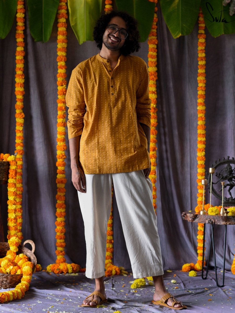 Yellow Cotton Full Sleeve Short Kurta for Men