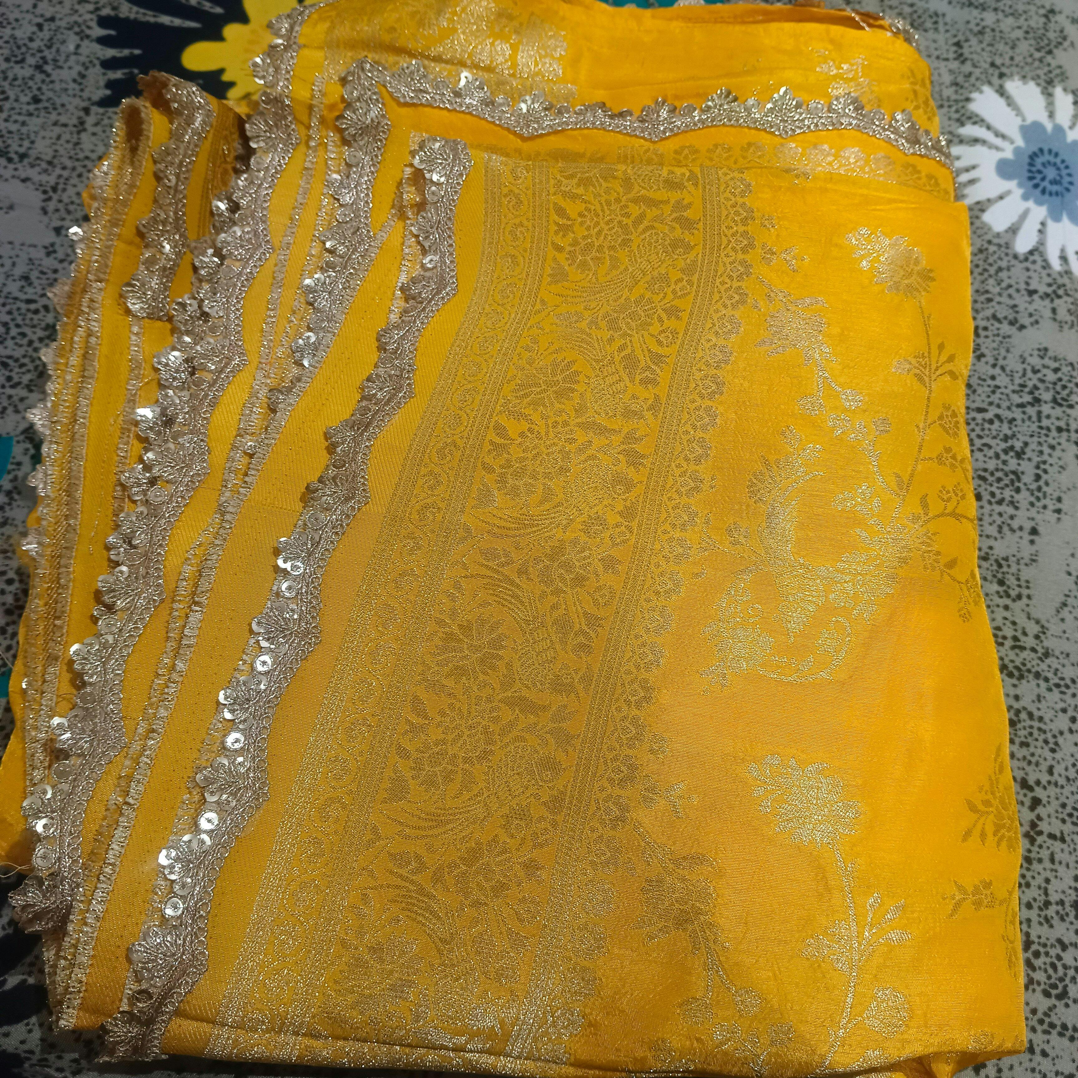 Brighten up your festive wardrobe with Haldi Hai, a joyful Sunshine yellow viscose saree. Its woven jaal design, enhanced with embroidered scallop lace & brocade borders, makes it the perfect pick for haldi rituals, wedding ceremonies, festive gatherings, and day celebrations.A saree that radiates warmth and cheer, ideal for haldi mornings and every occasion that calls for vibrant celebration.