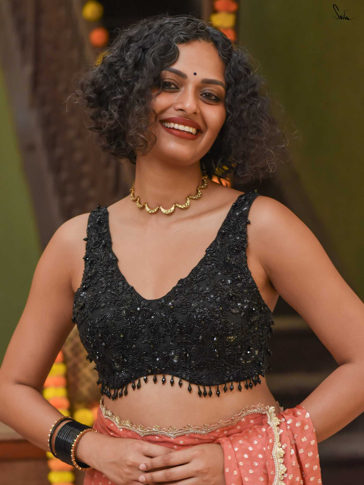 The model is wearing size S blouse and the saree is Garnet Sangria