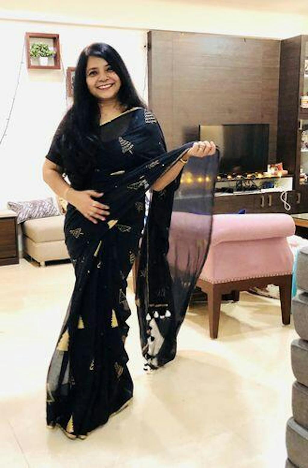 This black-gold mul cotton saree with beautiful Christmas-tree designs screen-printed on it, is a sure-shot heart stealer!