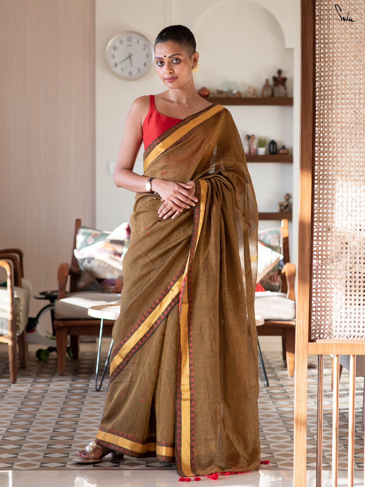 Brown Cotton Saree with Gold & Red Border Details