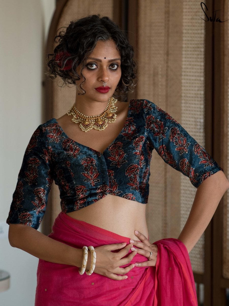 Ajrak is a craft whose origins can be traced to the civilisations of Mohenjo-daro and has since been practised in the regions of Sindh, Kutch and parts of Rajasthan. Each piece of Ajrak is a result of sixteen tedious steps and measures to ensure that there is no compromise in the vibrancy of the colours and precision in the print patterns on both sides of the cloth is achieved. It is commonly said amongst artisans that Ajrakh (Aaaj- Rakh) means to ˜keep it for a day, the longer the time dedicated to the cloth, the finer the quality.Part of what makes the craft so unique is the fact that unlike other crafts, where the patterns are directly printed on the cloth, Ajrak uses the method of resist-dye to achieve geometrical vibrant patterns.Our take started with the realisation that a regal craft like Ajrak belongs to a material that matches its grandeur, like velvet. An entirely unique product to the market, our new collection of Ajrak printed velvet blouses is full of warmth and show stopping elegance.Carefully block printed using natural dyes, the blouses can be further dressed up with your choice of saree or lehenga to create stunning looks for weddings and festivities.