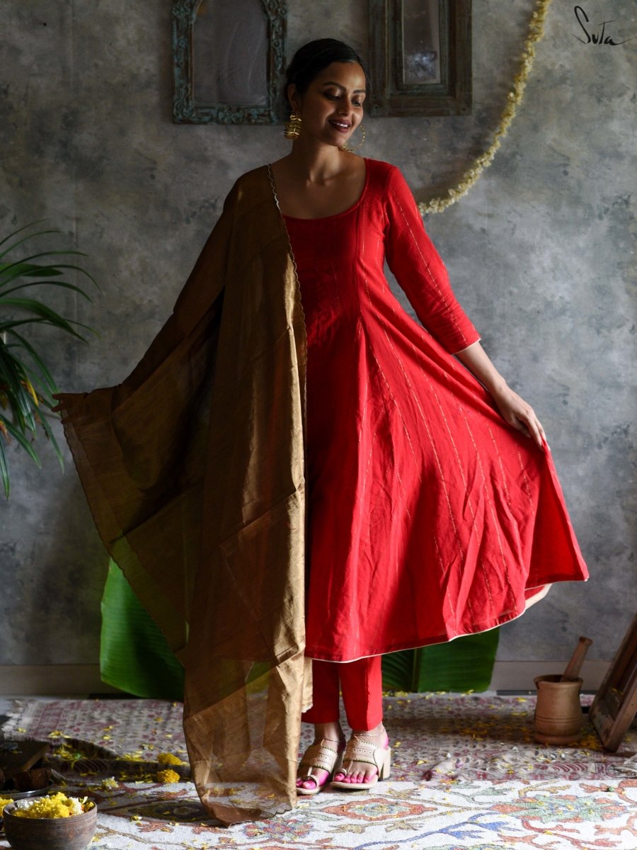 Cherish your innate sweetness, when you wear this stunning red kurta set made of mul cotton and embellished with zari.
