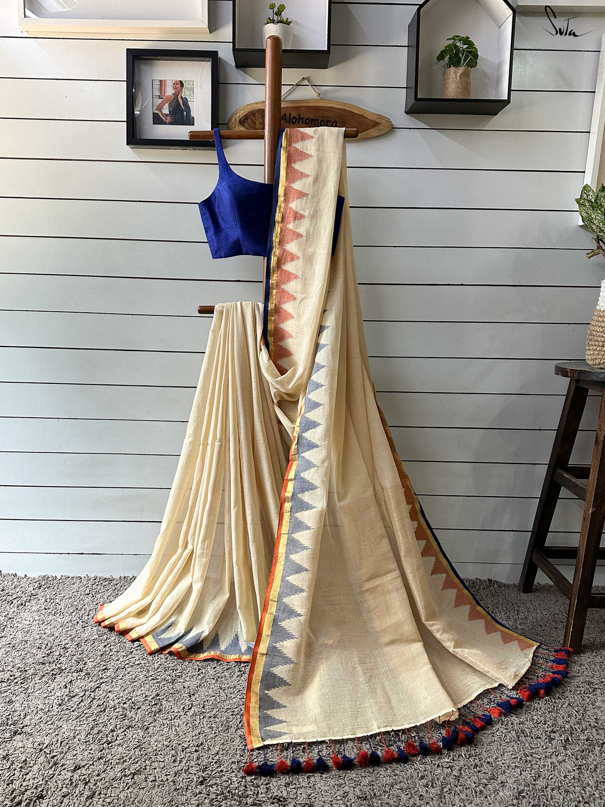 Beige Cotton Saree with Temple Border and Tassels