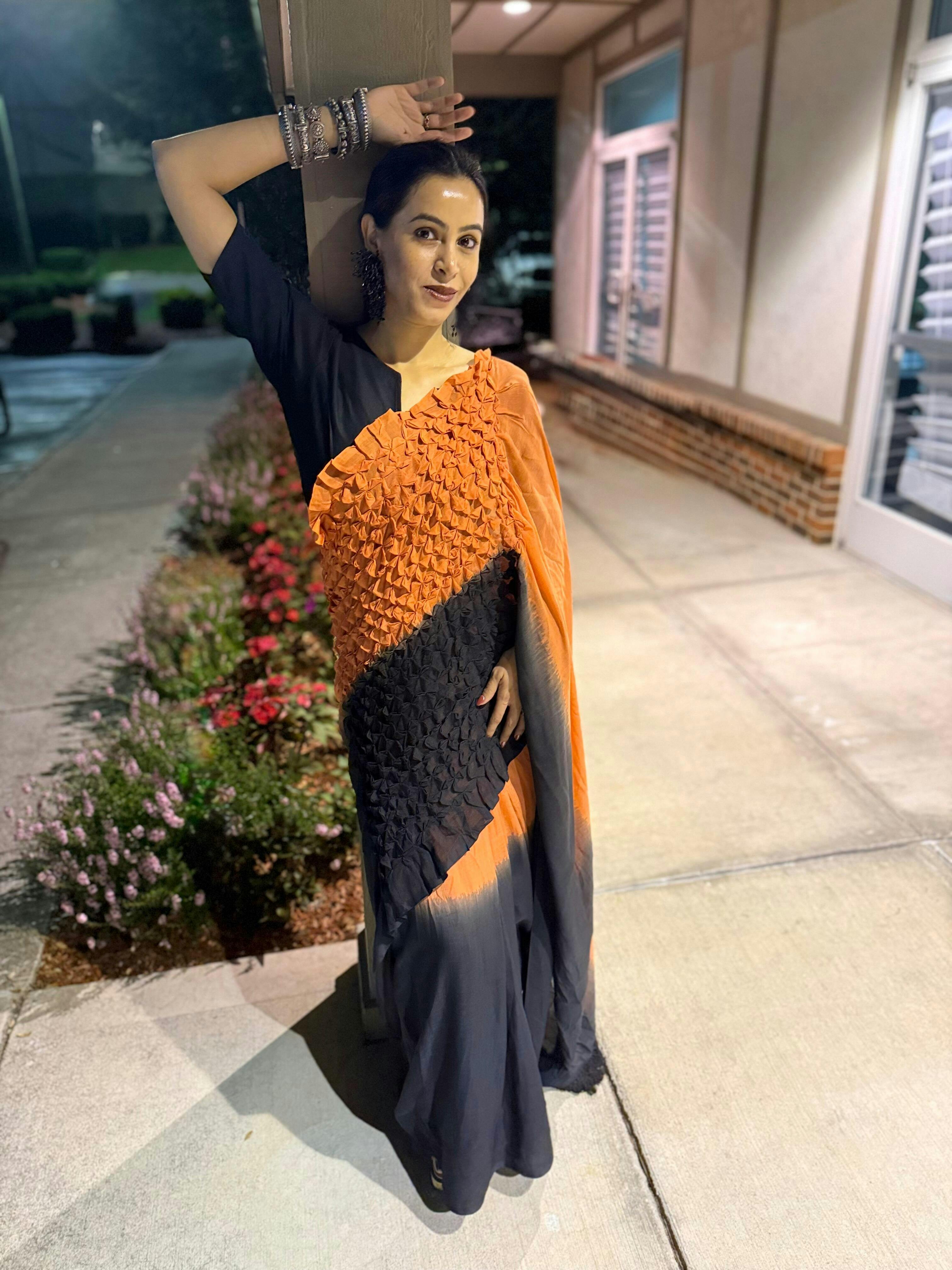 Bold and earthy, this rust and black ombre Mul Modal saree mirrors the drama of a monsoon sky. The tie-dye fades like storm clouds rolling in, while rust-toned smocking adds a layer of grounded texture. Contrasting black tassels bring structure to the softness, turning every drape into a statement. It’s a saree that holds fire and shadow in perfect balance.