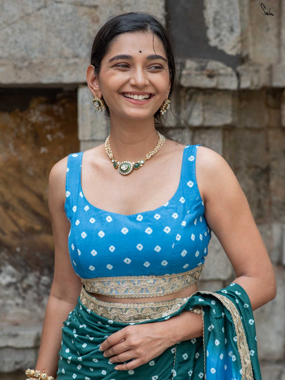 The model is wearing size S blouse and the saree is Mor sa Bandhej