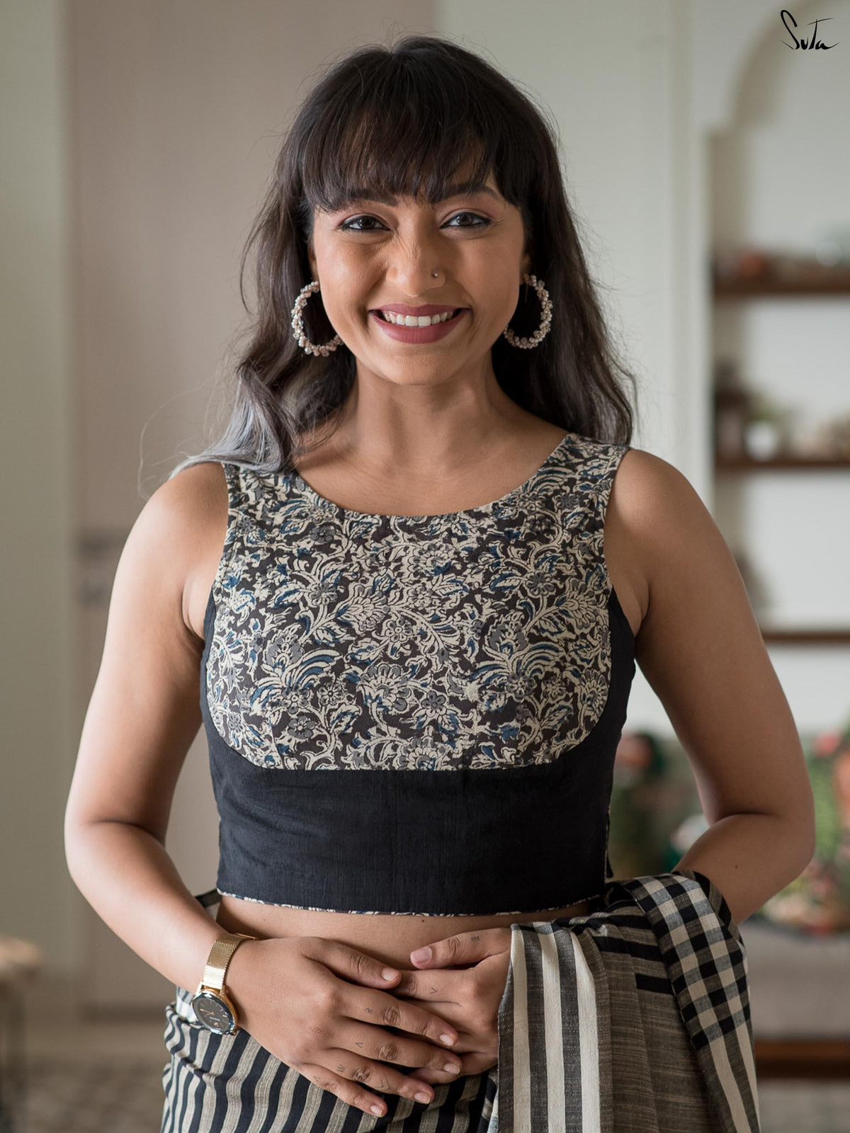 The model is wearing size S blouse and the saree from our inhouse collection.