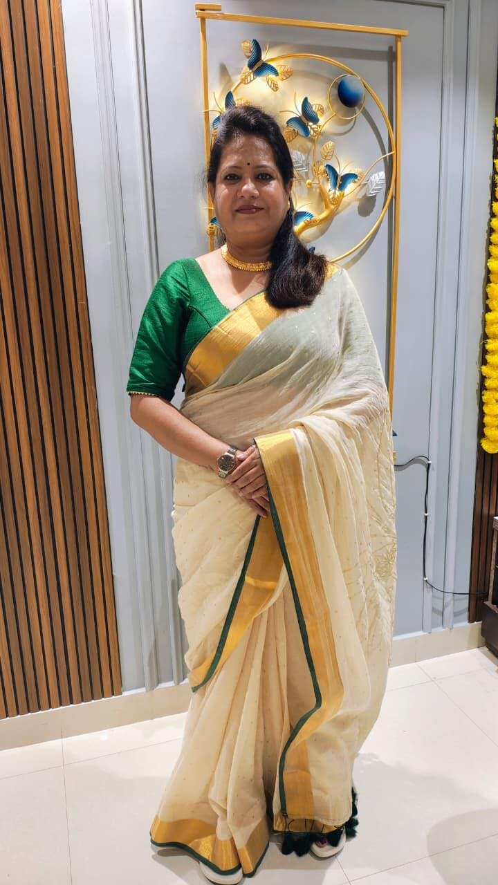 This harvest season, celebrate with Malli Poove, a collection curated especially for Onam.Kavyam is a visual poetry that captures the essence of Kerala . The smooth, off-white mul-cotton canvas provides captivating golden foil prints of Kathakali Performers. This saree, features a timeless gold zari and contrasting resplendent green tassels. Elevating the shimmering foil prints and making it a perpetual visual treat, this saree features hand-embellished sequins.