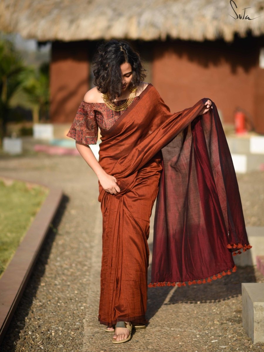 This rust and maroon handloom cotton saree is earthy and has a charm that is undeniable!