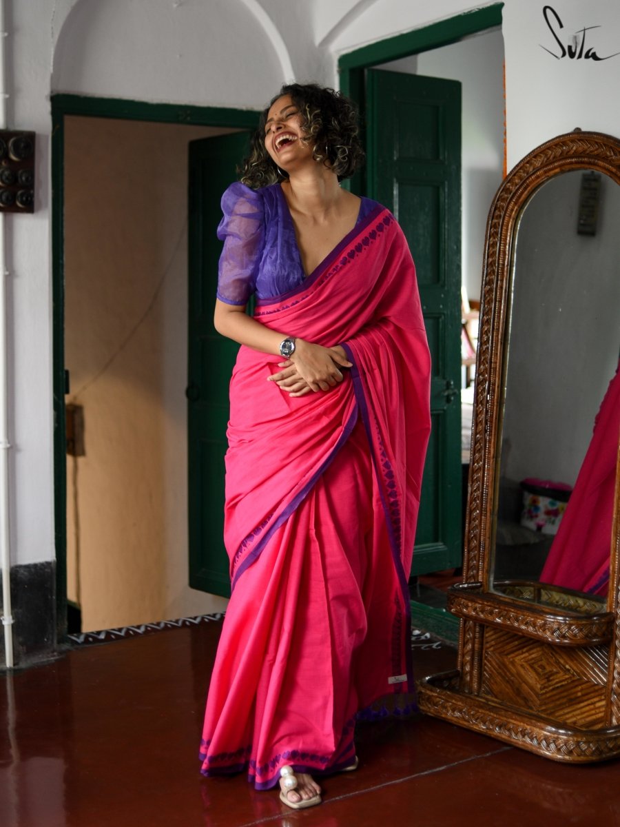The Khilta Dil saree is a beautiful handwoven pink cotton saree that is embellished with purple heart-shaped butis. This saree is a part of our latest saree collections. The pink saree design will accentuate and highlight your curves. Being a cotton saree design, the Khilta Dil saree is comfortable to wear in all seasons. It can be paired with a variety of blouses.