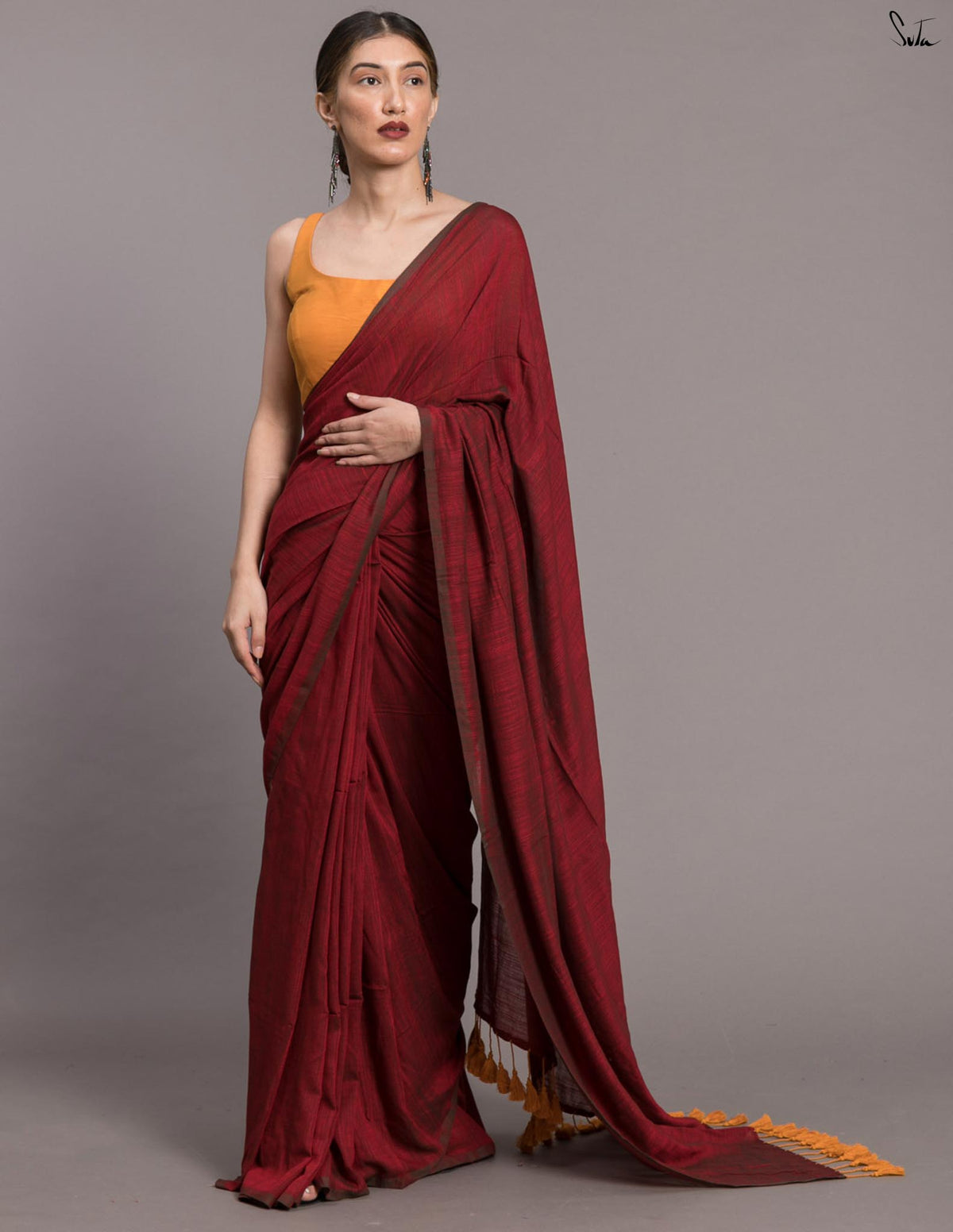 Maroon Cotton Acrylic Saree with Orange Tassel
