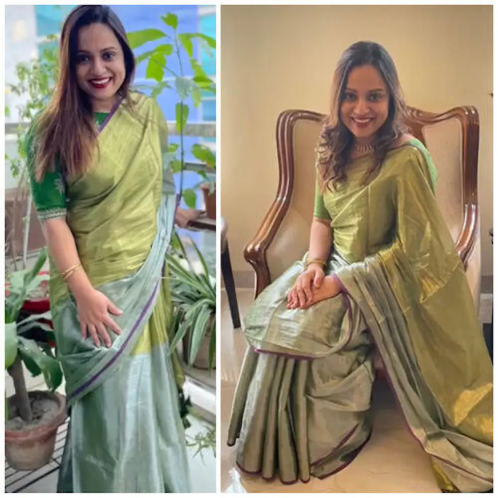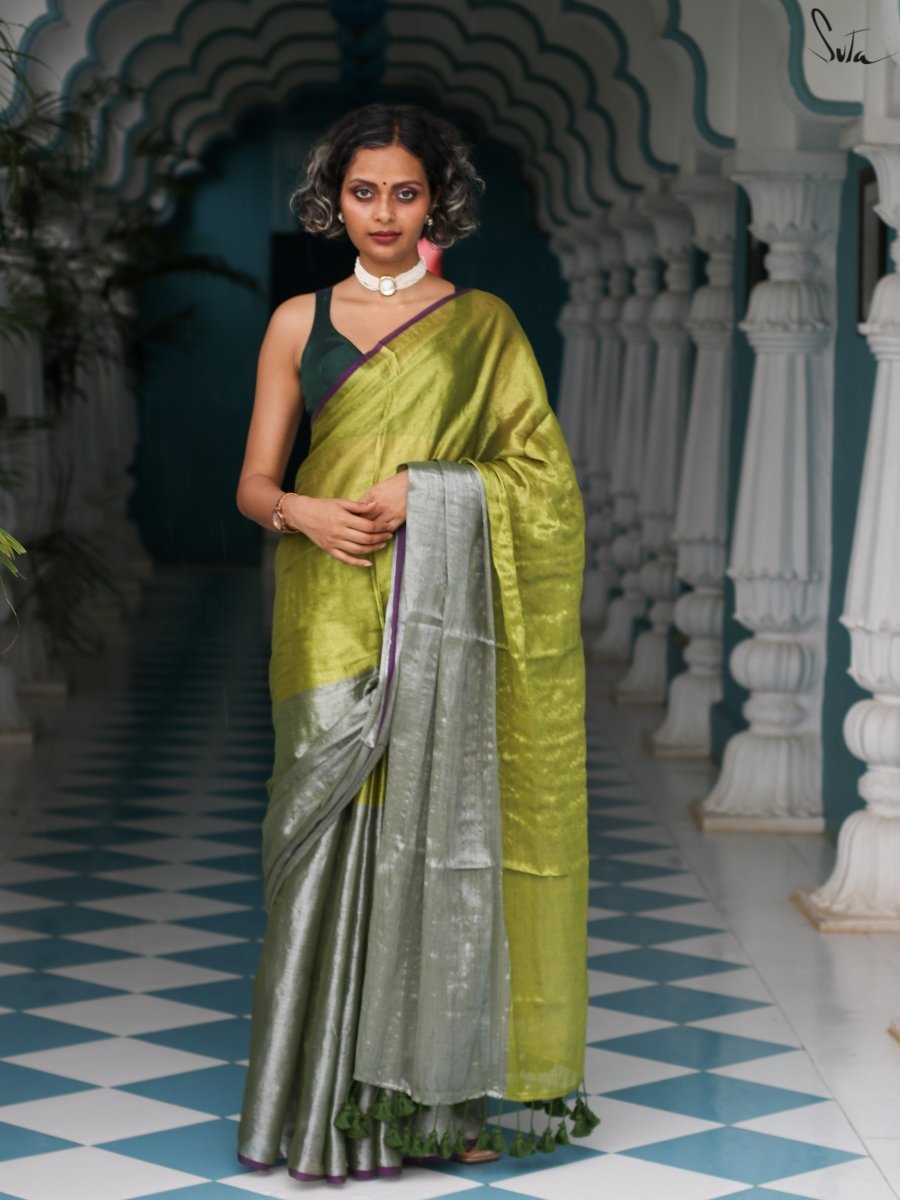Transform into a fearless crusader when you wear this lovely green saree, made of cotton and zari.