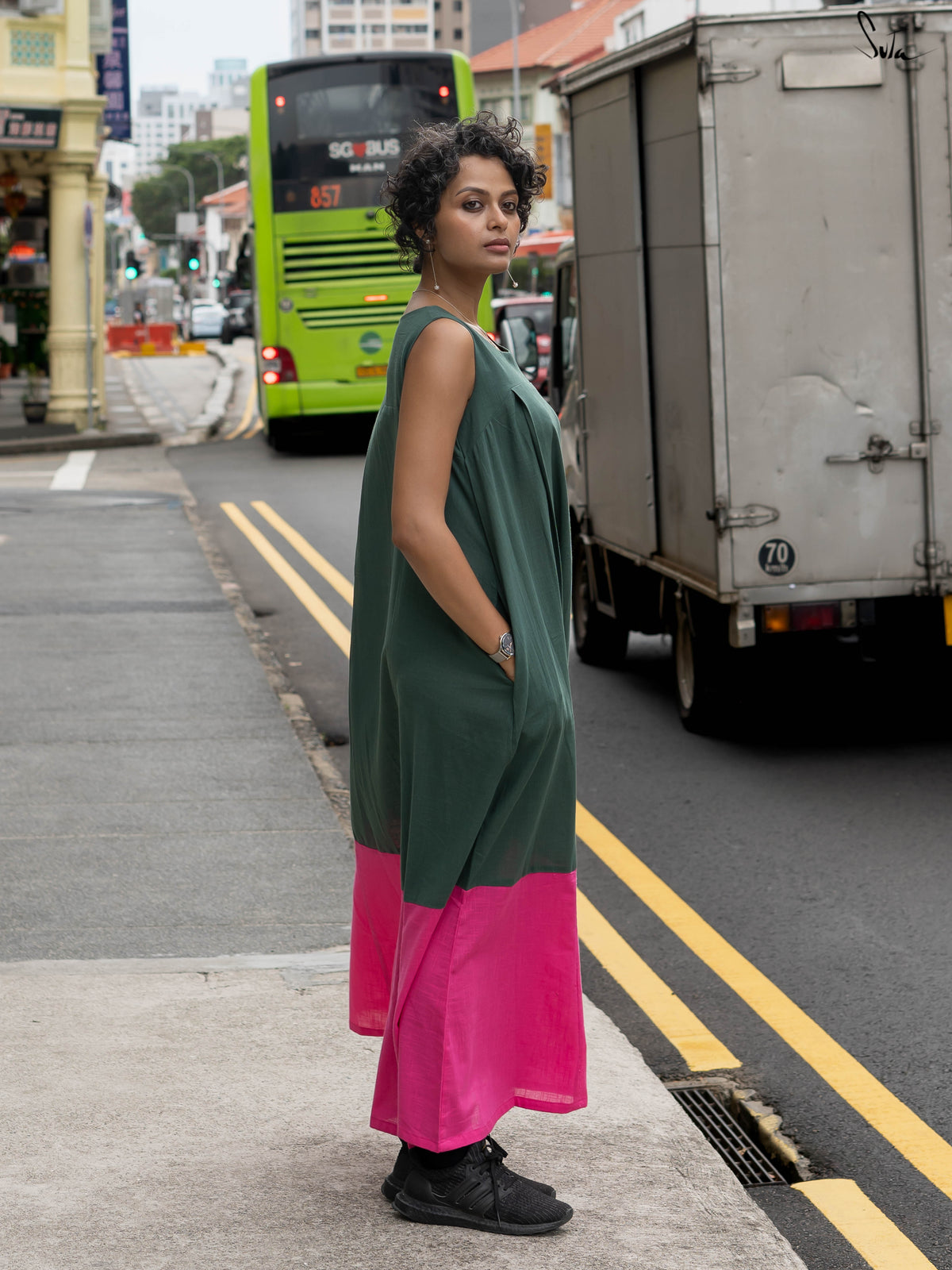 Pink and Green Cotton Flowy Long Sleeveless Dress with Pockets