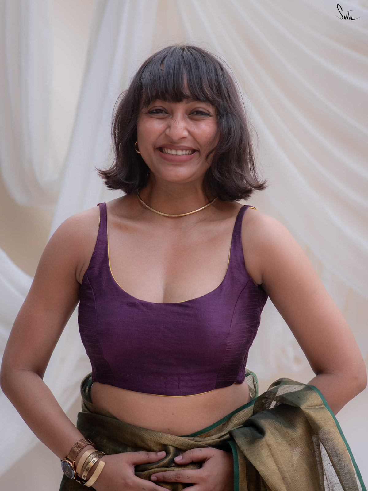 The model is wearing size XS blouse and the saree called Raga Sahana