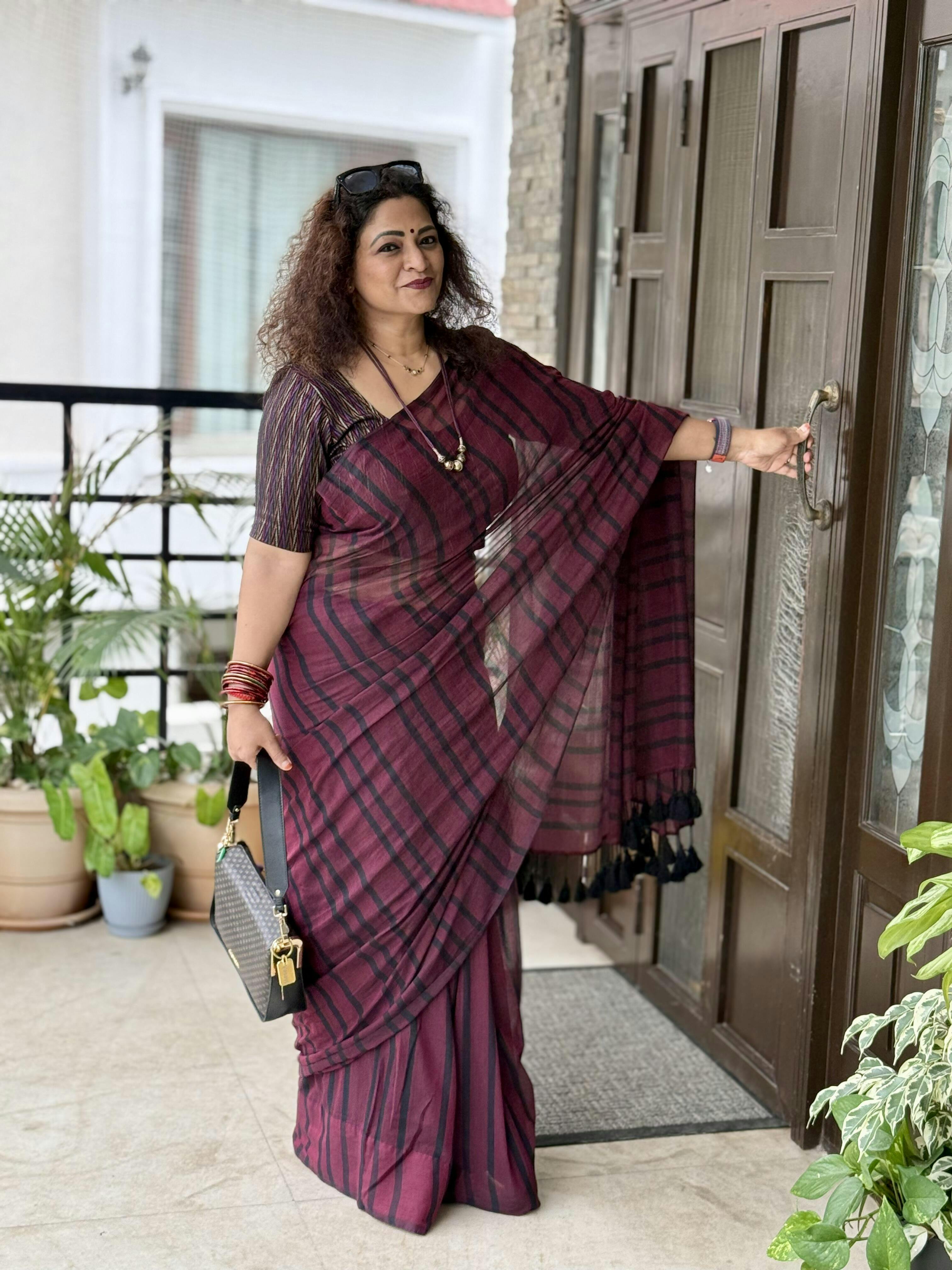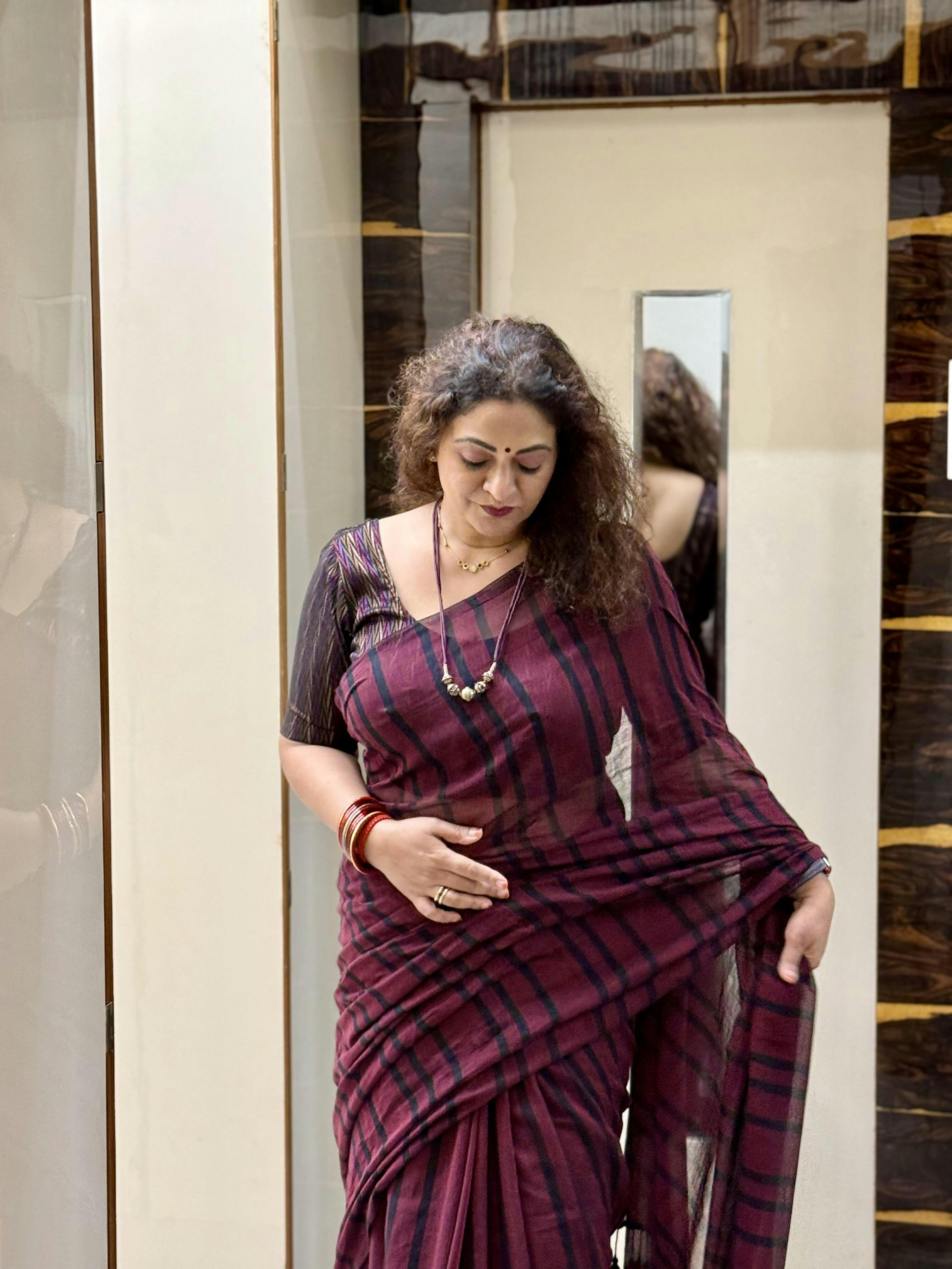 This maroon and black made in heaven mul saree is a splendid piece of beauty!