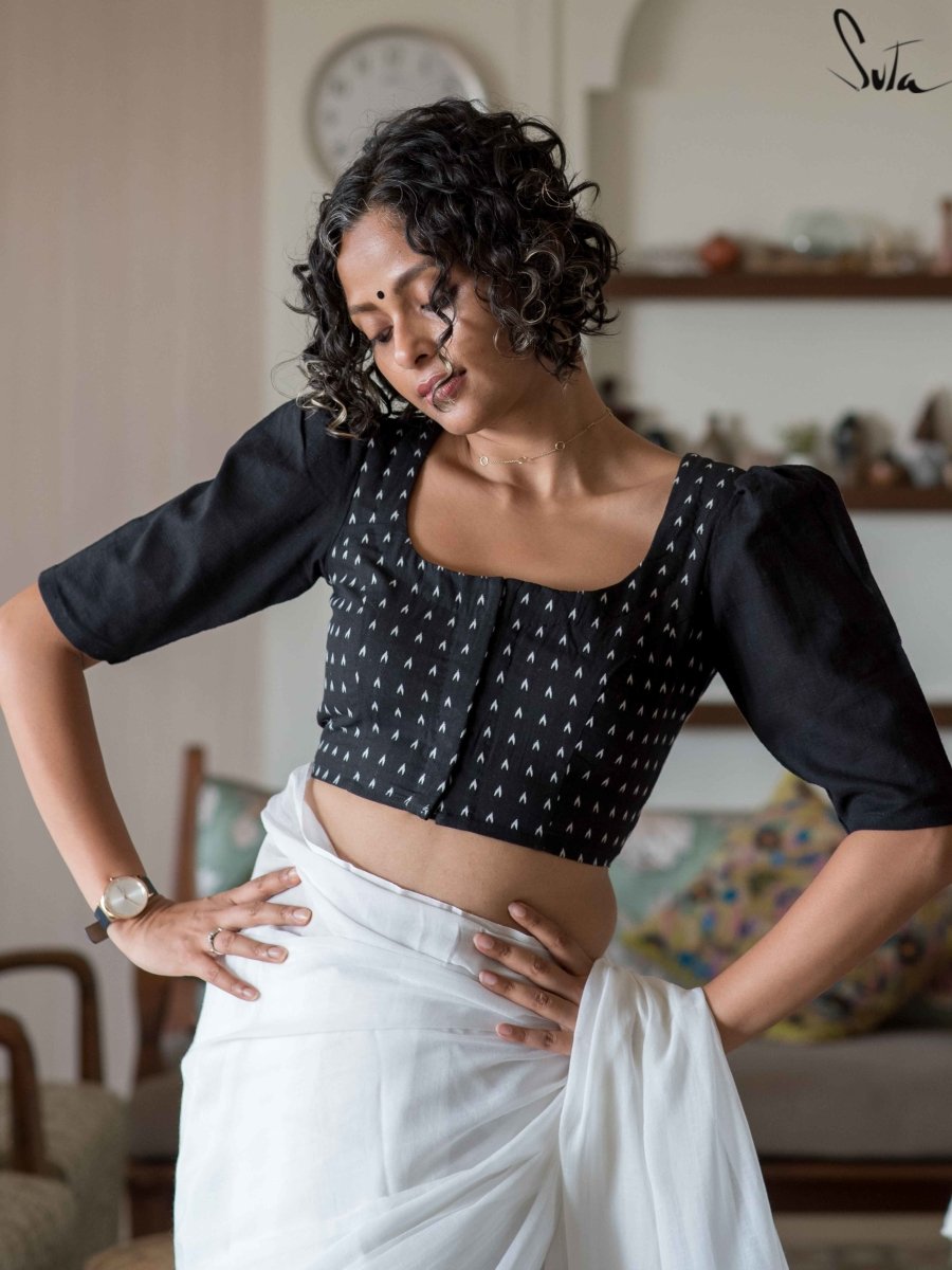 Black Cotton Elbow Sleeve Round Neck Blouse with Back Design