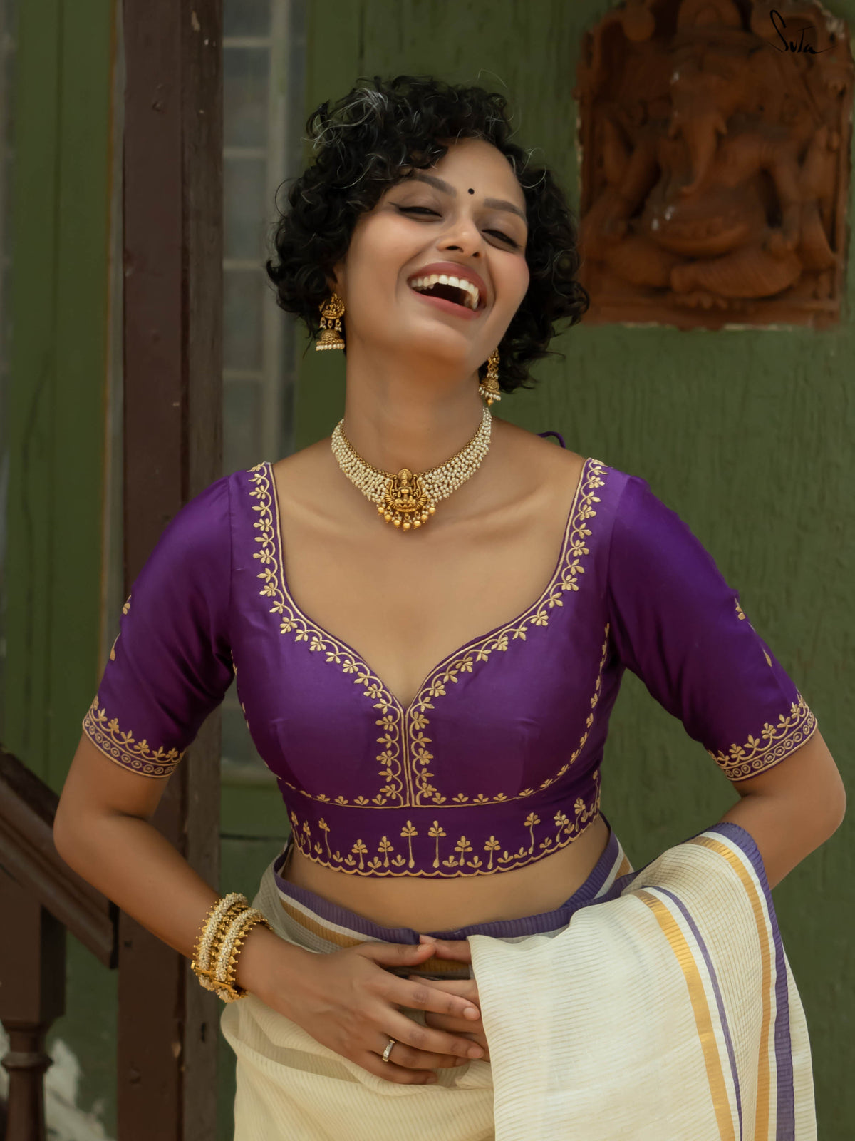 The vibrant purple color and intricate gold embroidery make it a perfect missing piece for your Onam outfit.